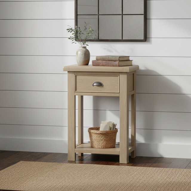 This robust piece is defined by its substantial thick oak top, providing a durable and stylish surface for a telephone, table lamp, or decorative display. Designed to maximise utility in smaller footprints, it features a single central drawer, finished with a traditional metallic cup handle, perfect for tucking away keys and post. Below, the open shelf provides additional space for organising footwear or displaying decorative baskets, ensuring your hallway remains tidy and inviting.