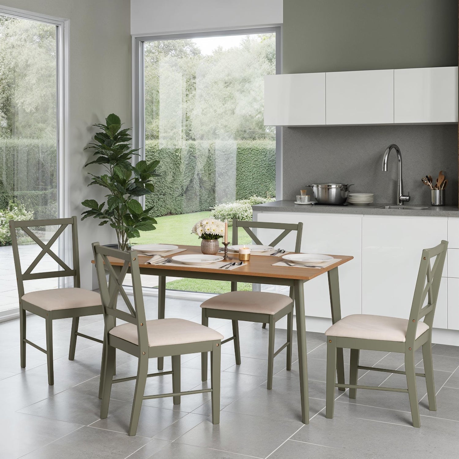 The rectangular table offers ample space for family meals and gatherings, while the four upholstered chairs provide a plush, comfortable seating experience. The soft mink microsuede fabric adds a luxurious feel, perfectly complementing the sage green finish for a sophisticated, on-trend look.