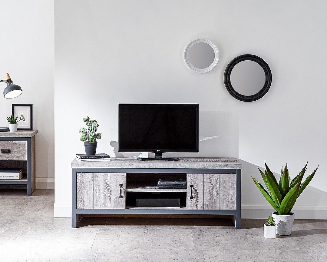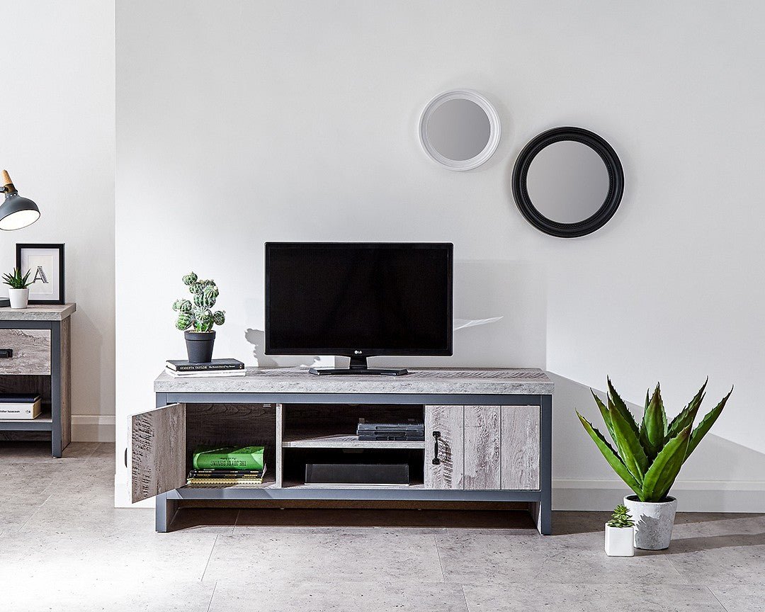 Even if you have only the most basic TV tech – TV screen plus viewing box or DVD player – you need somewhere to put it. If you would prefer that your furnishings reflected an industrial aesthetic, this TV unit from the Boston range is the perfect choice. The unit’s neat construction pairs a central open shelving section with a pair of magnetic door-fronted cupboards in a chunky format that screams urban chic. The 30mm top panel is complemented by a thick frame in contrasting dark grey. Ideal for an understated interior.
