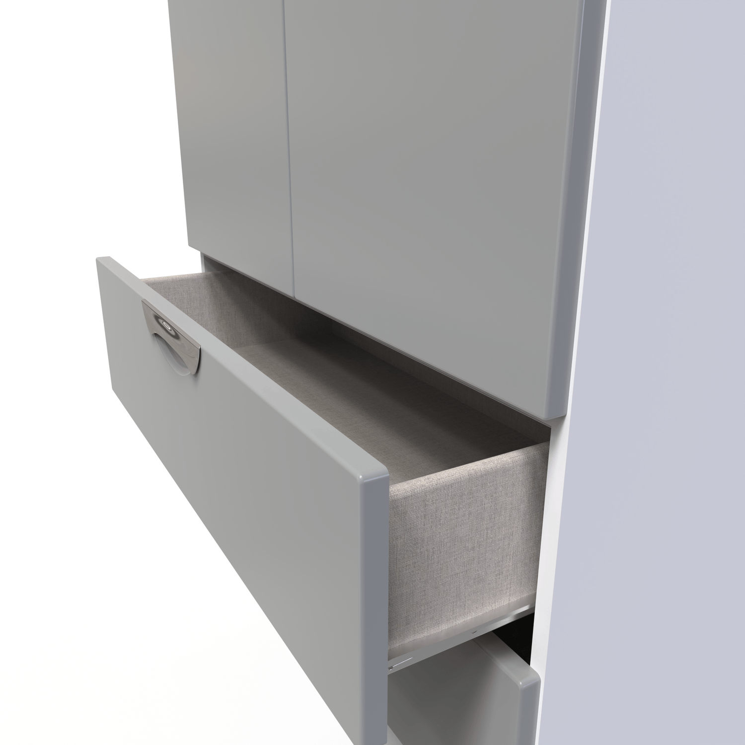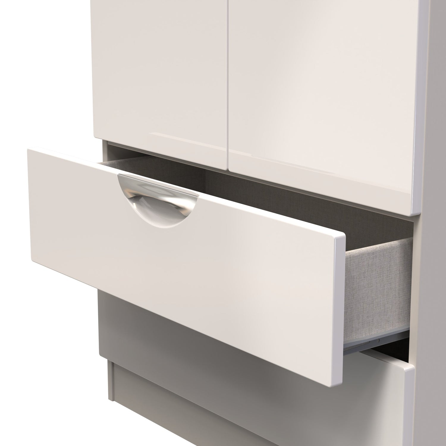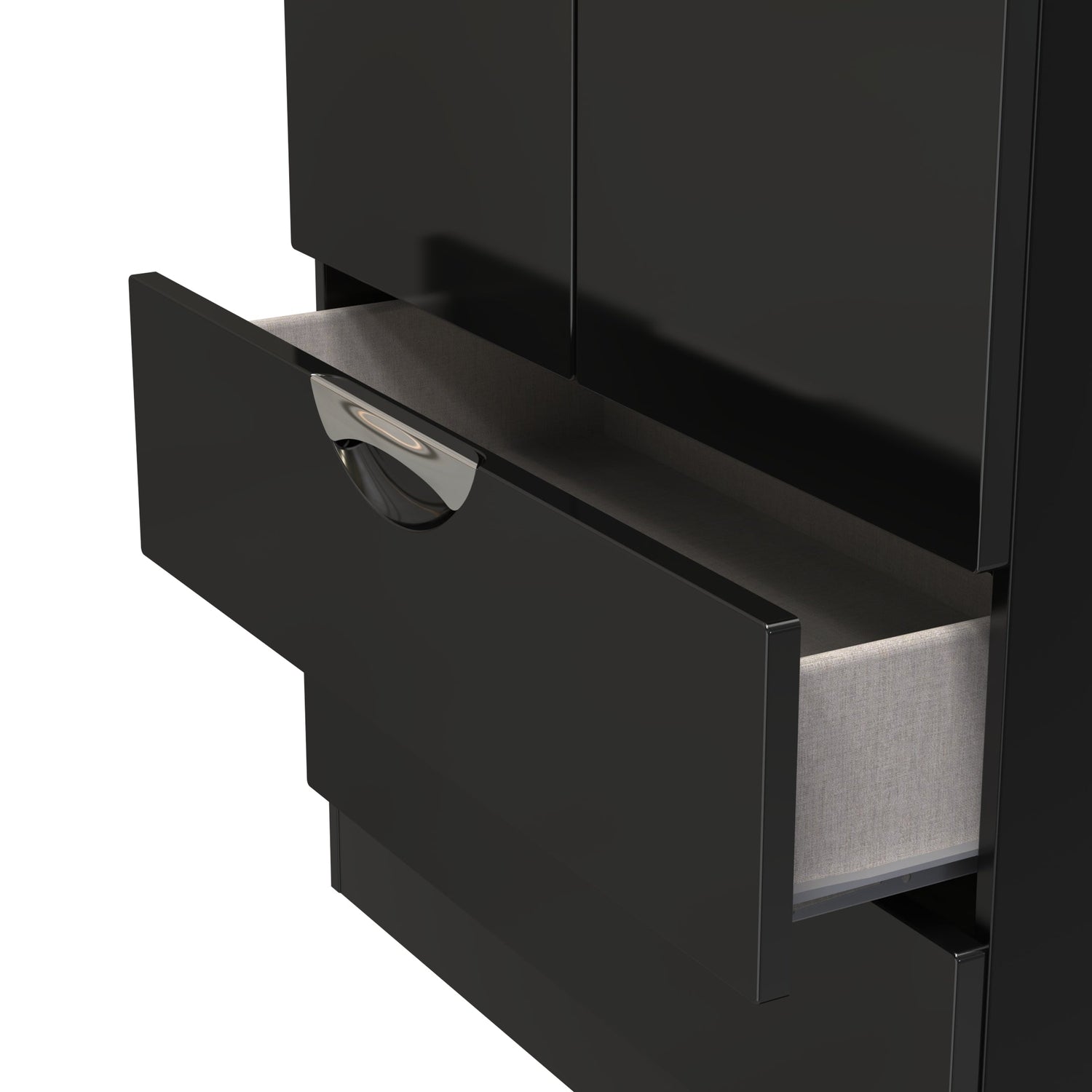 Introducing the Camden Black Gloss 2 Door 2 Drawer Wardrobe, offering a clean, contemporary aesthetic and practical functionality for modern homes. Designed to provide organised space, its scratch-resistant veneer ensures durability against everyday wear. The doors, with distinctive cut-out handles, enhance its style and functionality - a perfect addition to any home.