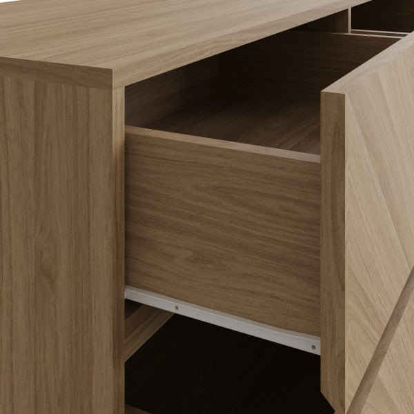 Delivering both style and practicality, this spacious full-width four drawer chest features Herringbone inspired wood-grain design drawer fronts which make a true statement in any room setting. The handle free drawer system opens smoothly on the metal runners providing plenty of storage space for all your personal items. This chest of drawers arrives ready to assemble with instructions included.