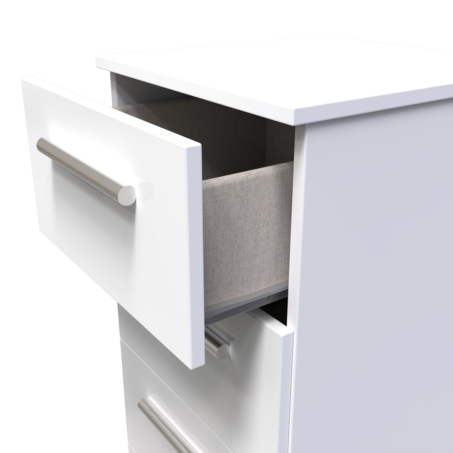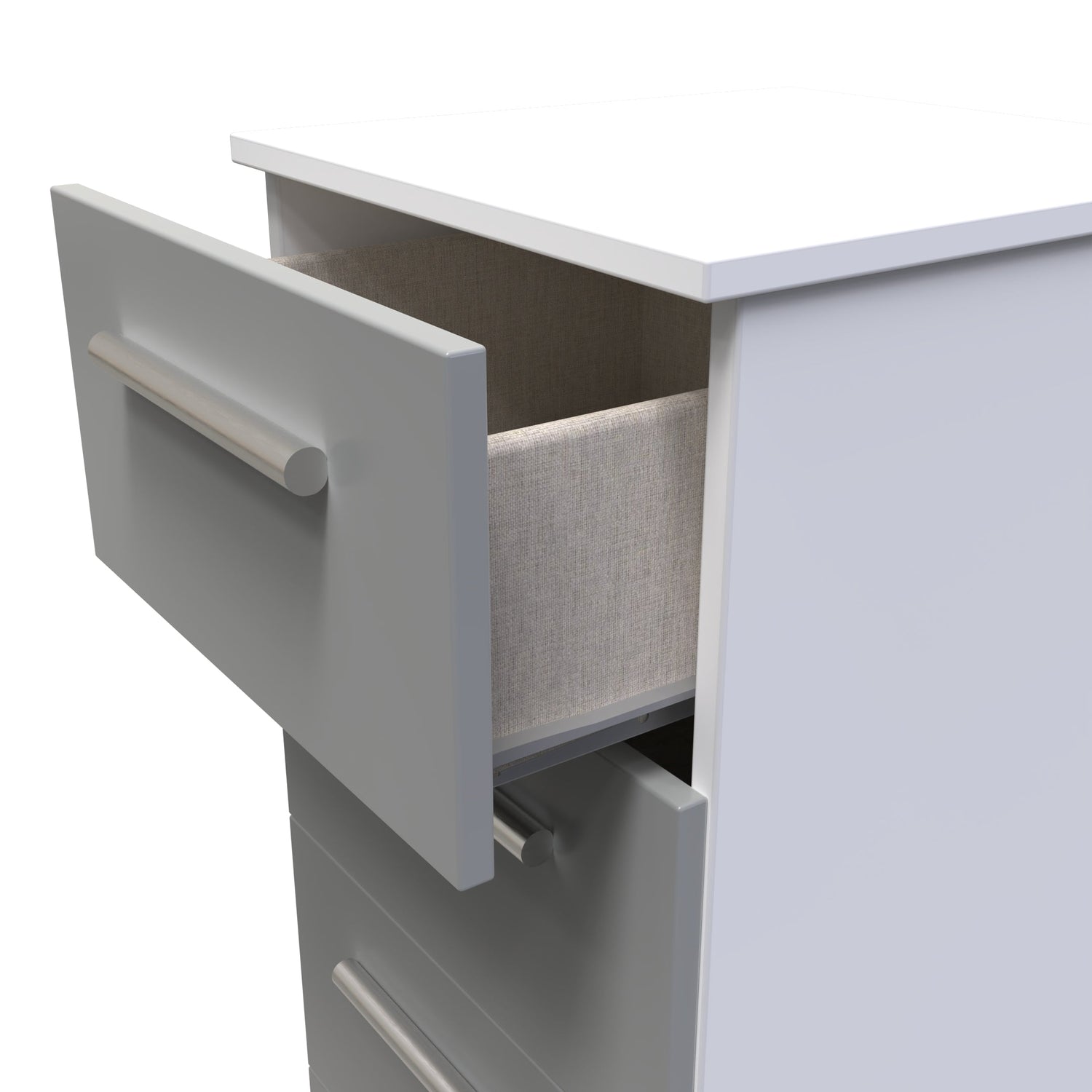 Elevate your bedroom to perfection with the exquisite Contrast Denim Blue 4 Drawer Bedside range, designed to fulfil your dreams of a stunning bedroom space. Crafted from premium materials and boasting long-lasting finishes, this range exudes elegance and sophistication. Each piece is crafted to enhance the beauty of any bedroom style. The fronts of the Contrast range are adorned with sleek metal handles, adding a touch of modern flair. As you open the drawers, you'll be greeted by the smooth gliding of metal runners and the luxurious linen-look interior, offering both style and functionality. Delivered fully assembled for your convenience, this range is the perfect way to effortlessly transform your home.