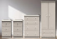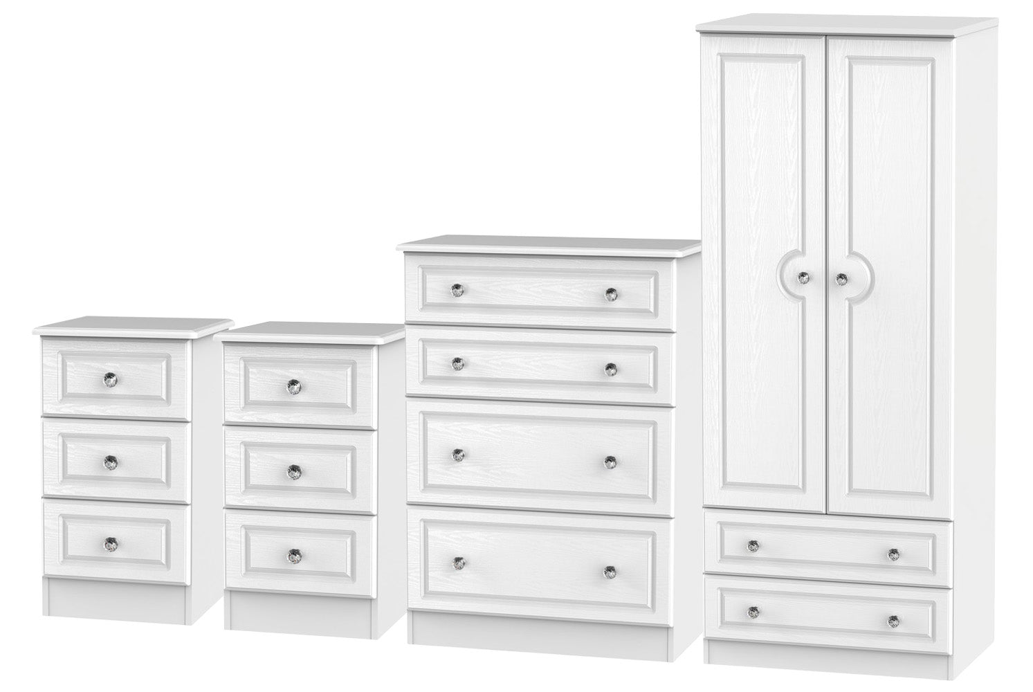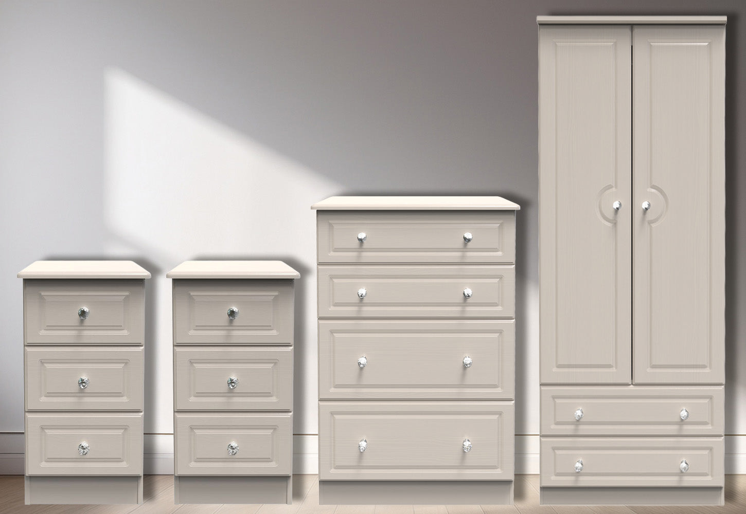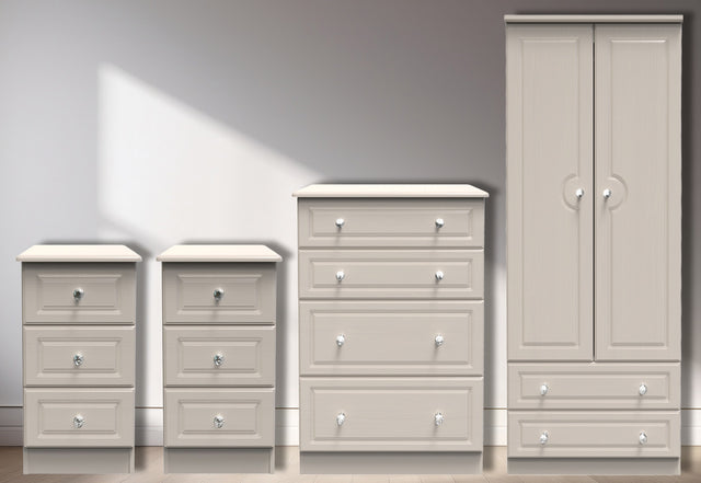 The collection includes two 3 Drawer Bedside Tables for essential bedside storage, a 4 Drawer Deep Chest for clothing and linens, and a 2 Door 2 Drawer Wardrobe with both hanging and drawer space – providing everything you need for a perfectly organised bedroom.