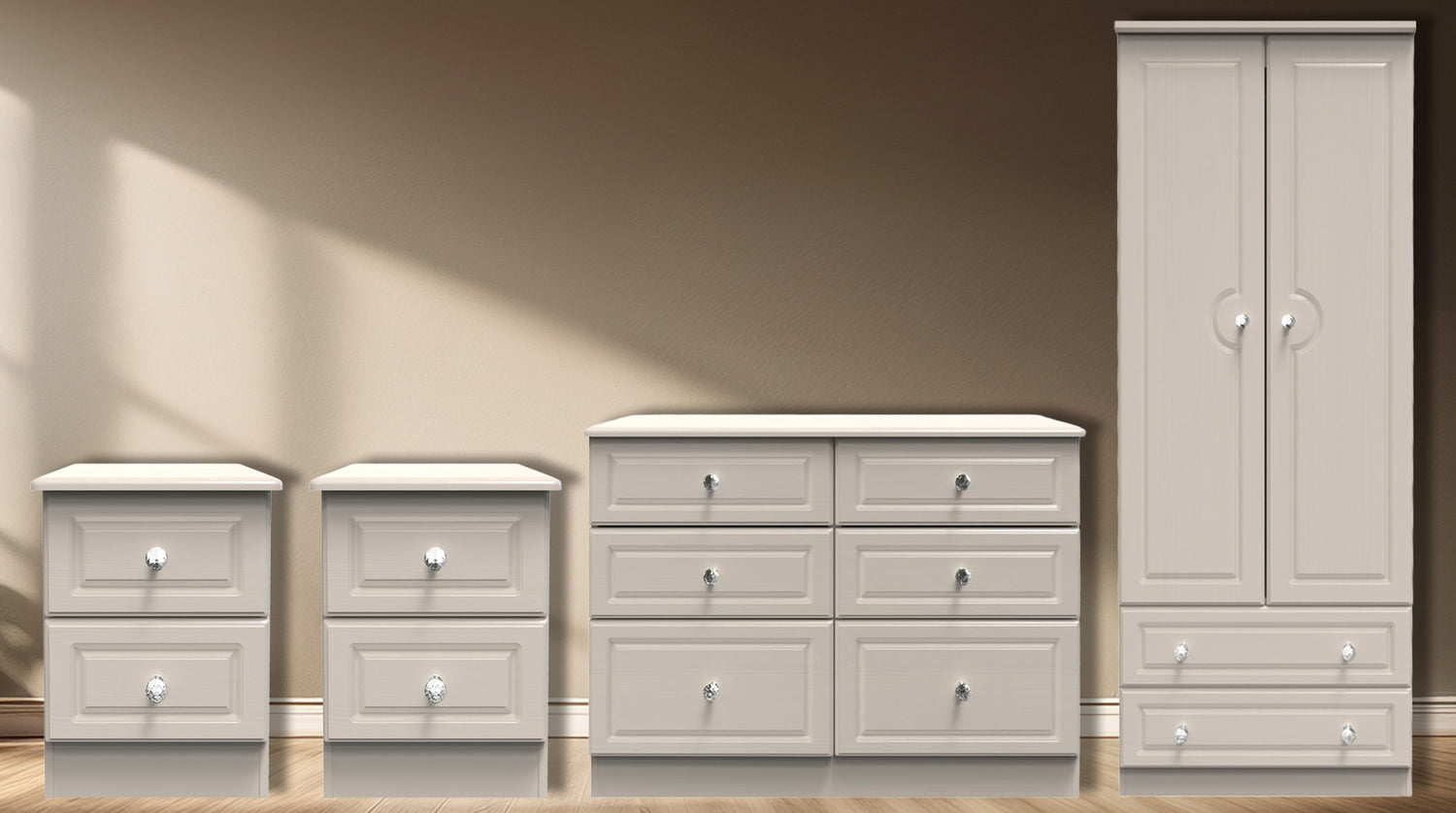 The Crystal 4 Piece Bedroom Set blends timeless elegance with practical storage, making it a beautiful and functional addition to any home. Featuring a traditional design with unique door and drawer fronts, this set is available in Kashmir Ash or White Ash, two versatile finishes that complement both classic and modern interiors.