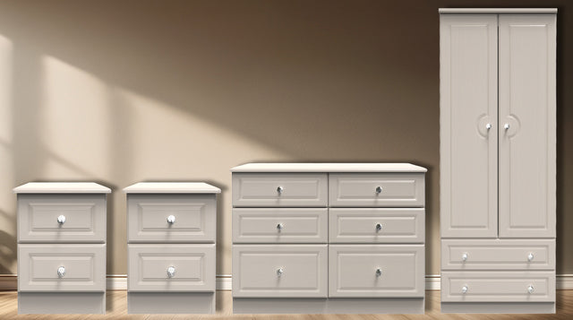 - Includes: two 2 Drawer Bedside Tables, 6 Drawer Midi Chest, and 2 Door 2 Drawer Wardrobe