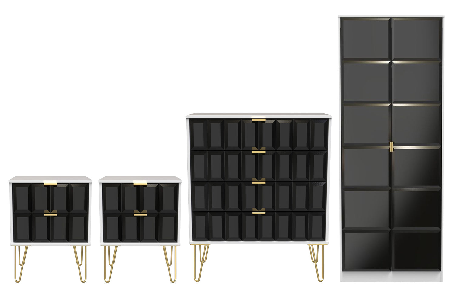 - Bedside tables and chest feature stylish gold hairpin legs