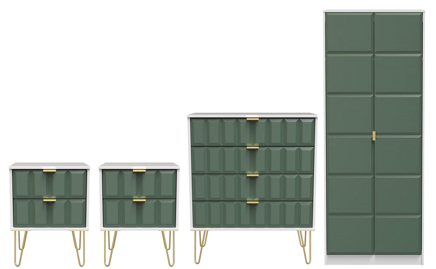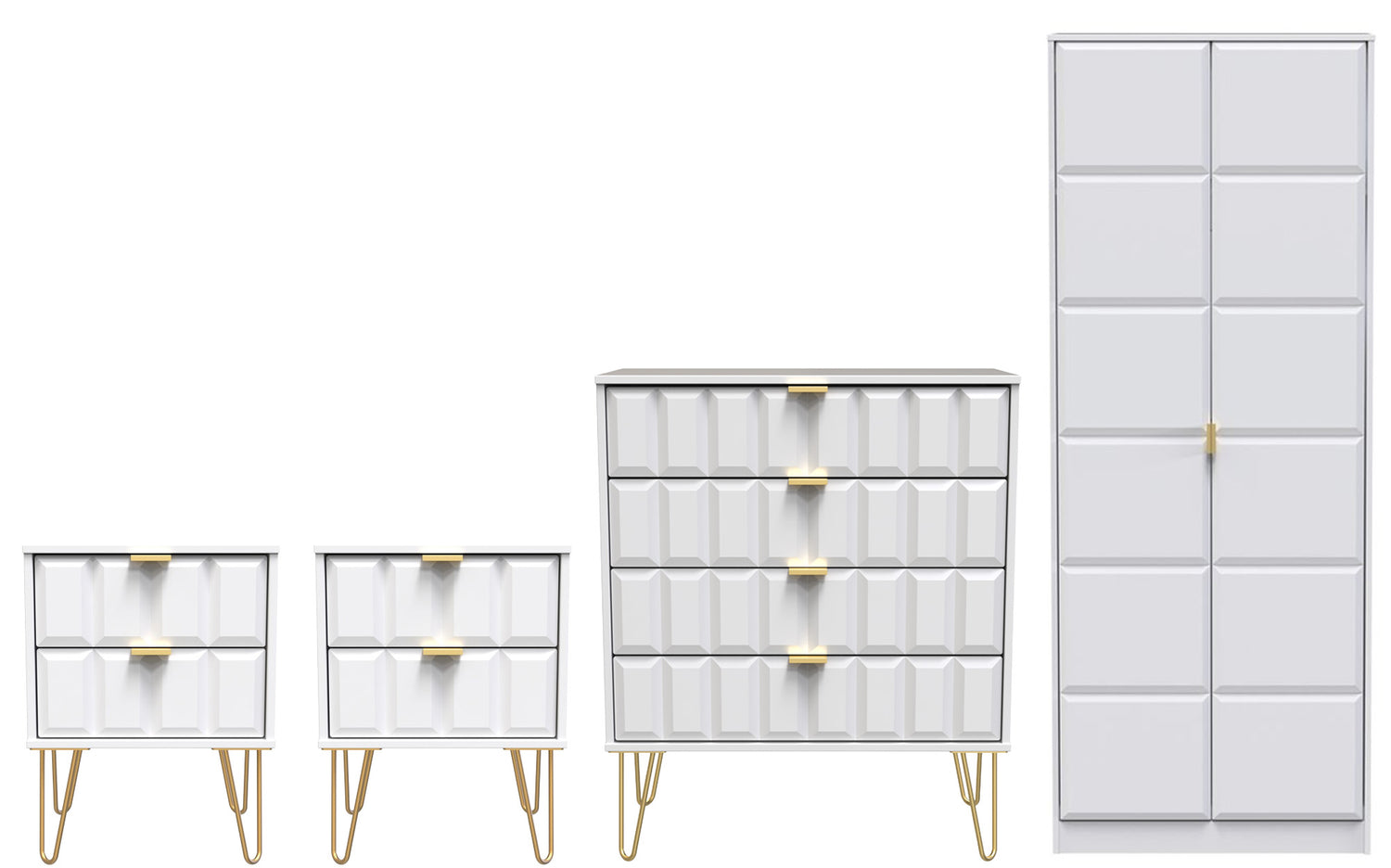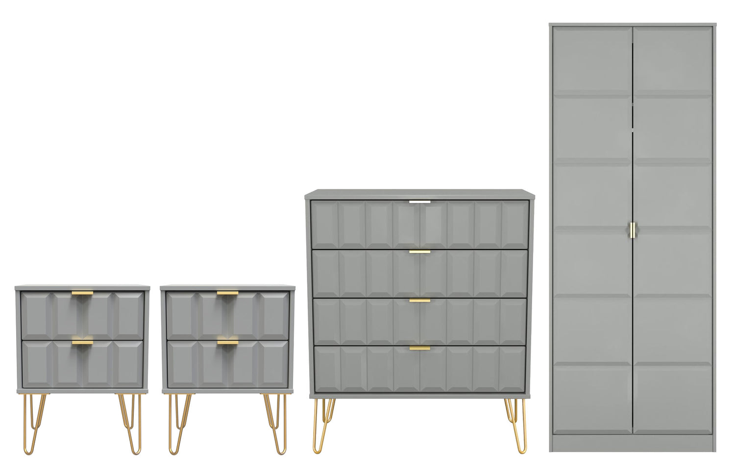 The set includes two 2-drawer bedside tables and a 4-drawer chest, each finished with elegant gold hairpin legs for a touch of retro-inspired style. The 2-door double wardrobe provides generous hanging space for clothing and accessories, while the drawers offer plenty of room for folded garments and essentials.