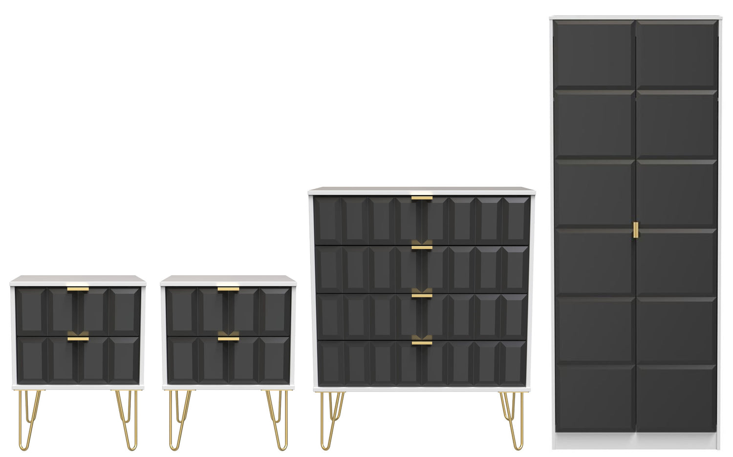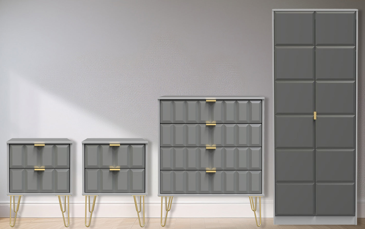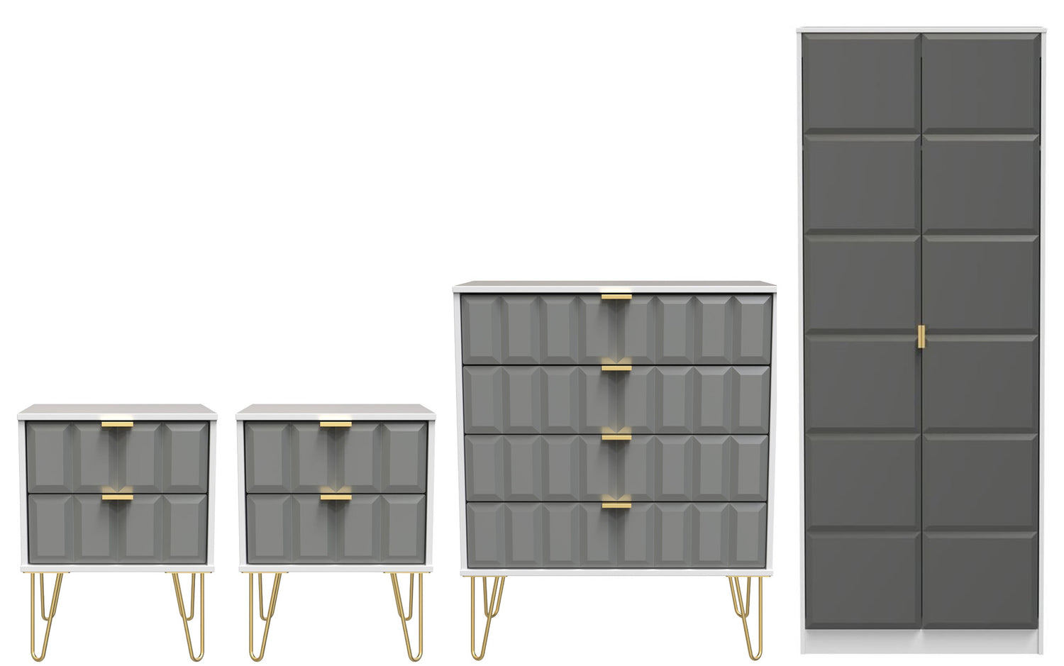 The set includes two 2-drawer bedside tables and a 4-drawer chest, each finished with elegant gold hairpin legs for a touch of retro-inspired style. The 2-door double wardrobe provides generous hanging space for clothing and accessories, while the drawers offer plenty of room for folded garments and essentials.