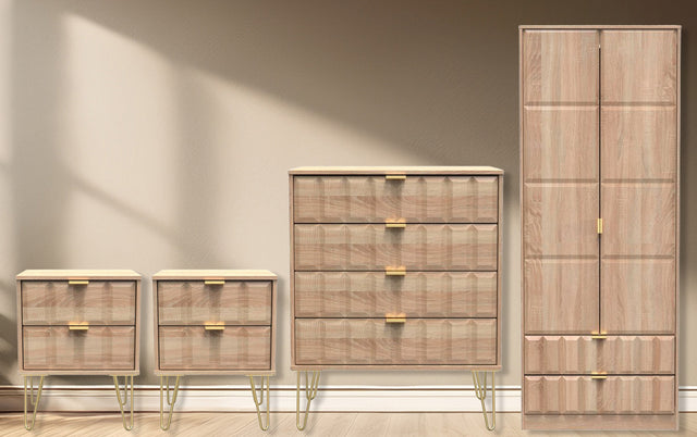 The Cube 4 Piece Bedroom Set in Bardolino Oak blends standout design with everyday practicality, making it an ideal choice for a modern, stylish bedroom. Featuring a distinctive cube geometric pattern across every door and drawer front, it adds a bold focal point to your space while offering excellent storage.