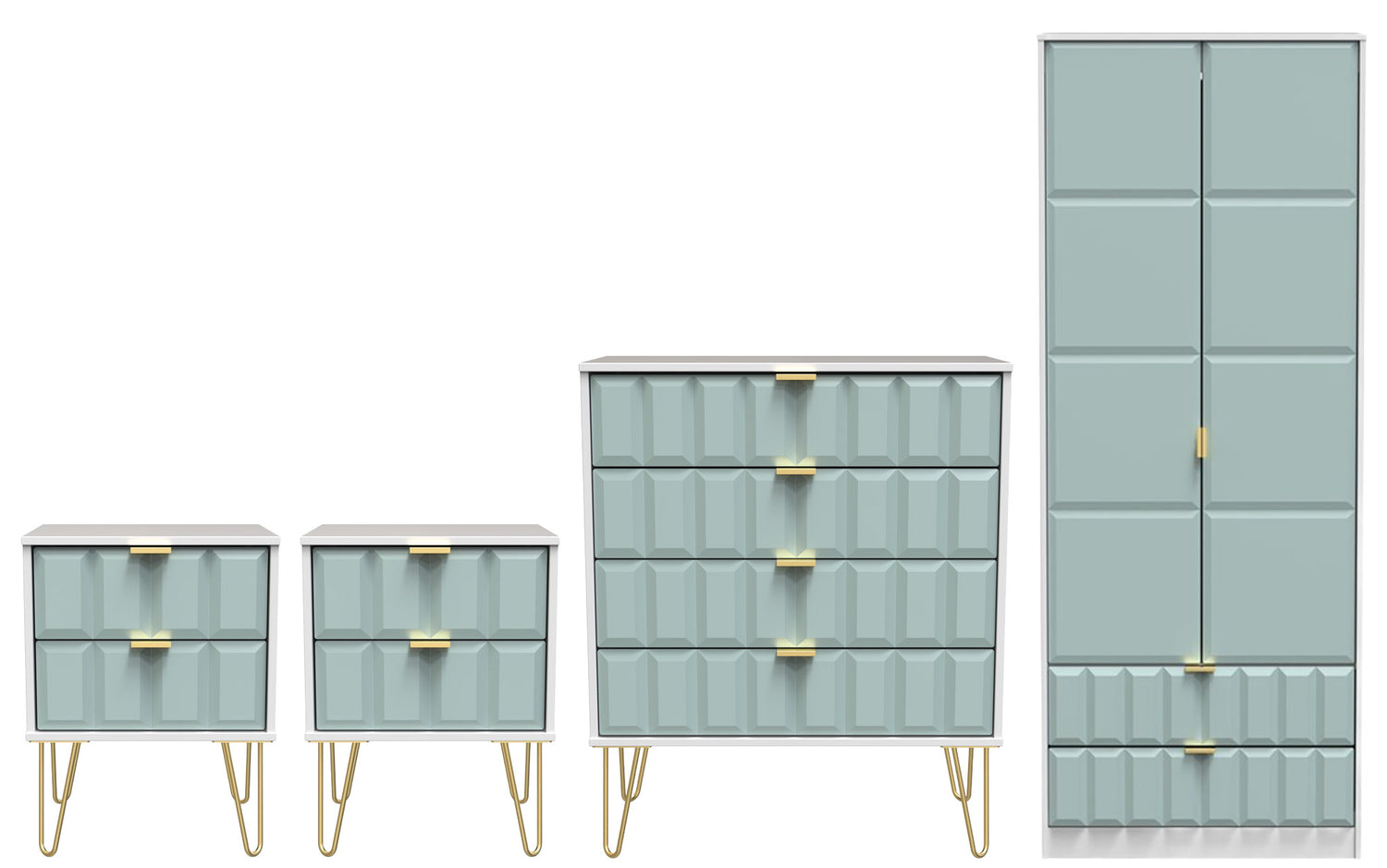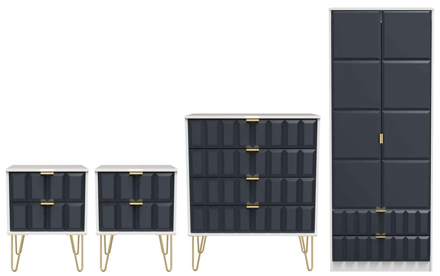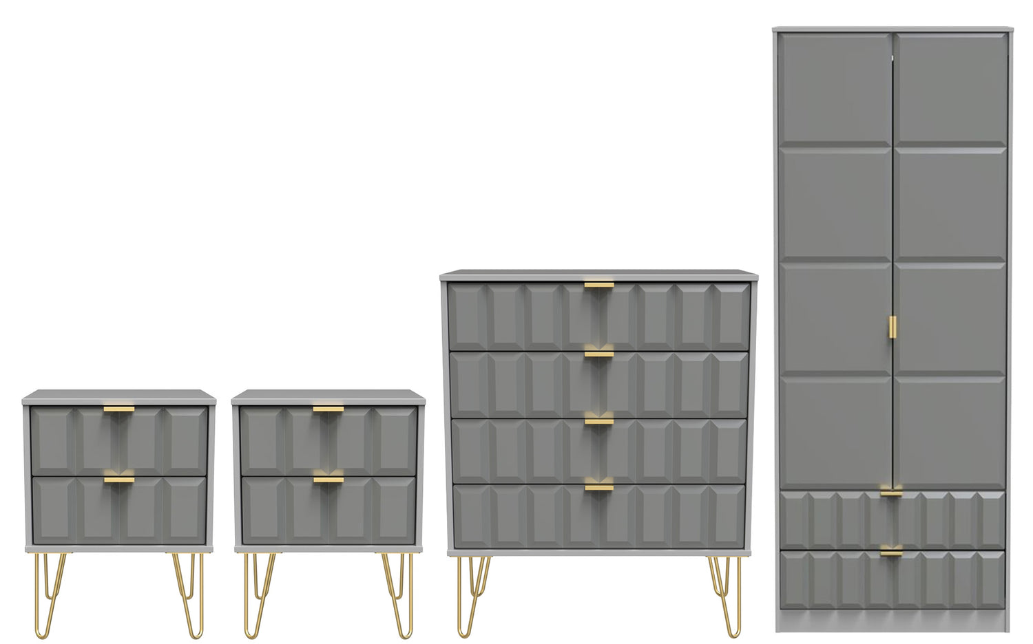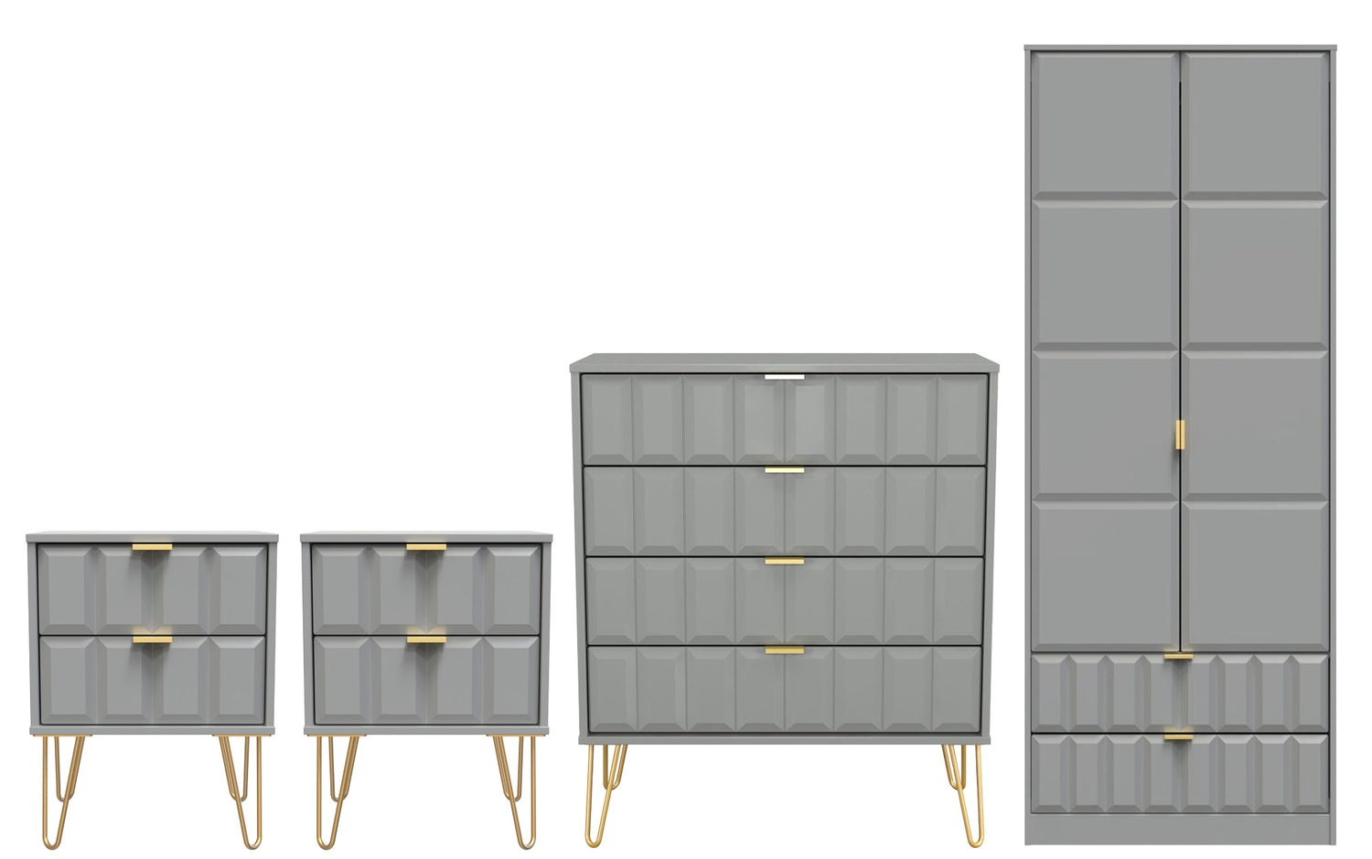 This coordinated set includes two 2-drawer bedside tables and a 4-drawer chest, each finished with elegant gold hairpin legs that bring a touch of retro-inspired glamour. The 2-door, 2-drawer double wardrobe provides generous hanging space for clothing and two lower drawers for folded garments or accessories.