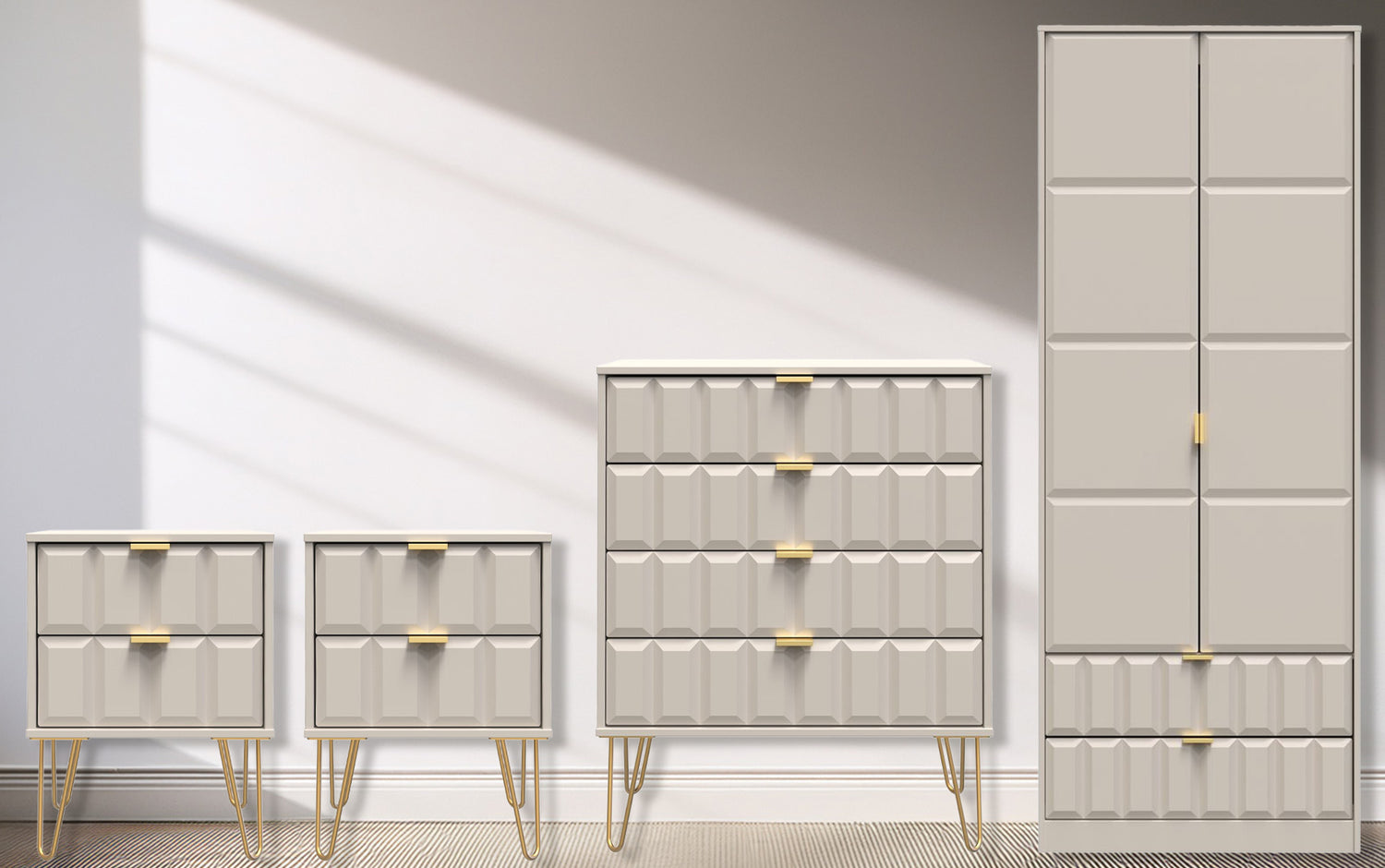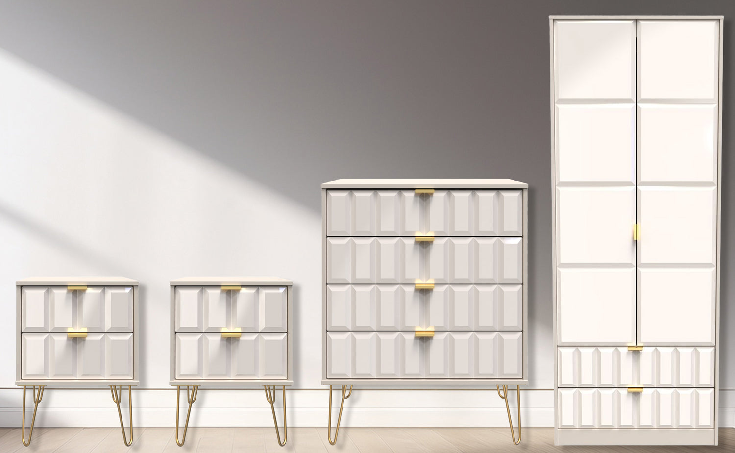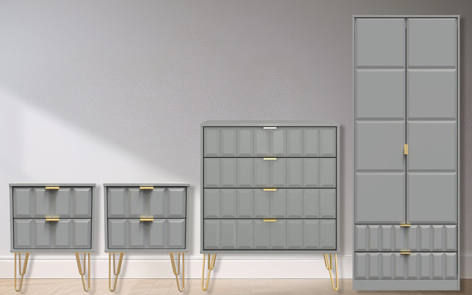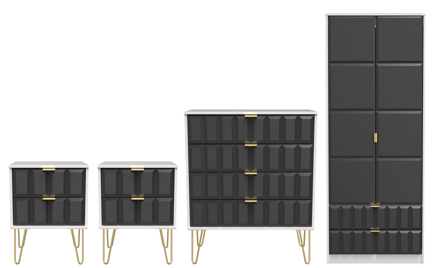 This coordinated set includes two 2-drawer bedside tables and a 4-drawer chest, each finished with elegant gold hairpin legs that bring a touch of retro-inspired glamour. The 2-door, 2-drawer double wardrobe provides generous hanging space for clothing and two lower drawers for folded garments or accessories.