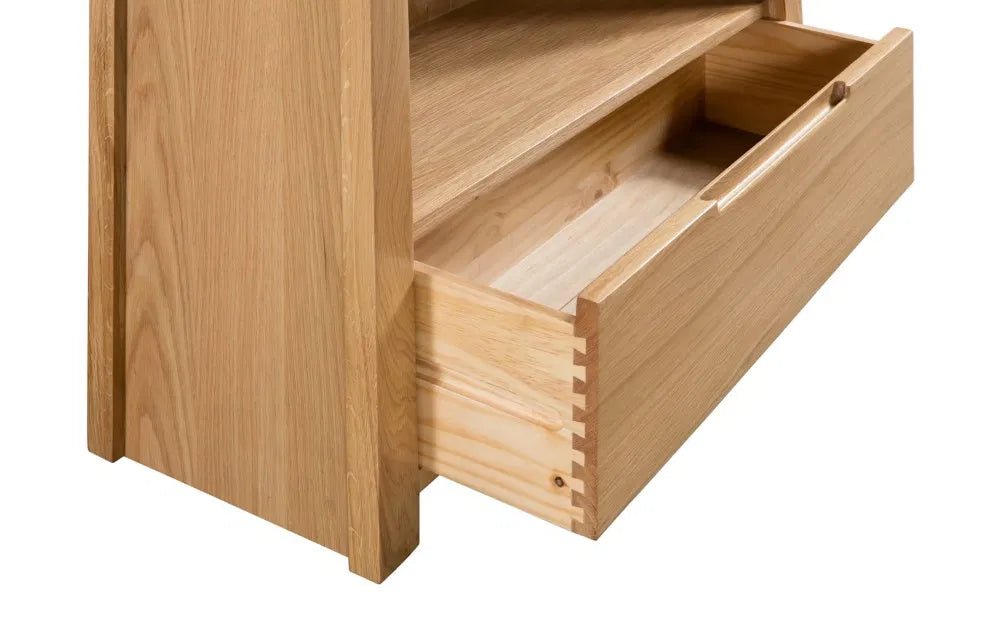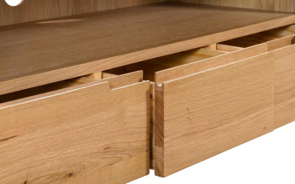 The Curve 3 Drawer TV Unit offers a sleek and practical design, perfect for modern living spaces. Finished in warm oak, it features a curved profile that softens the overall look while providing functional storage. Three spacious drawers keep media essentials hidden, and an open shelf provides easy access for devices.