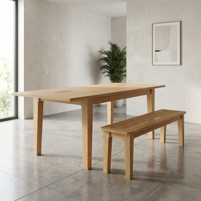 The Cypress Dining Bench combines timeless Scandinavian-inspired design with practical seating for any dining space. Featuring rattan detailing on the seat, it offers a unique and stylish touch that complements a variety of interiors.