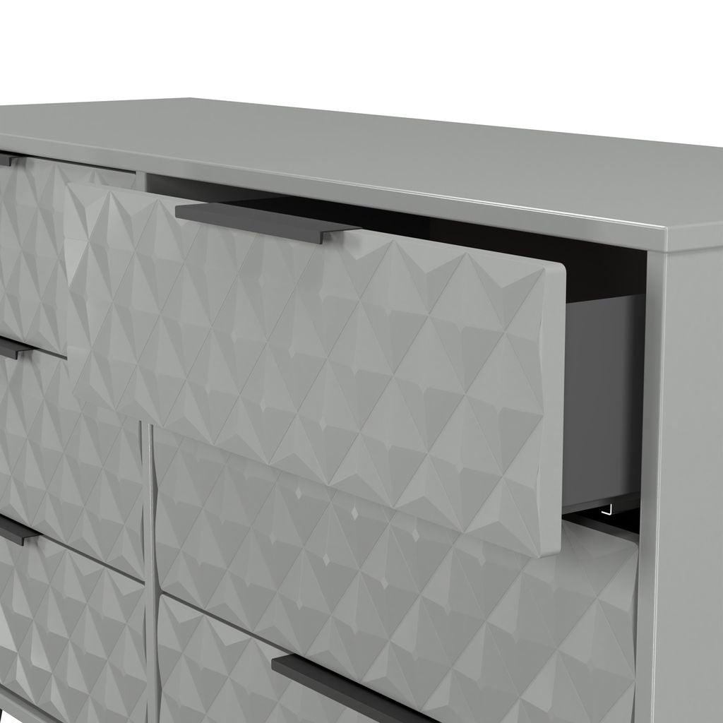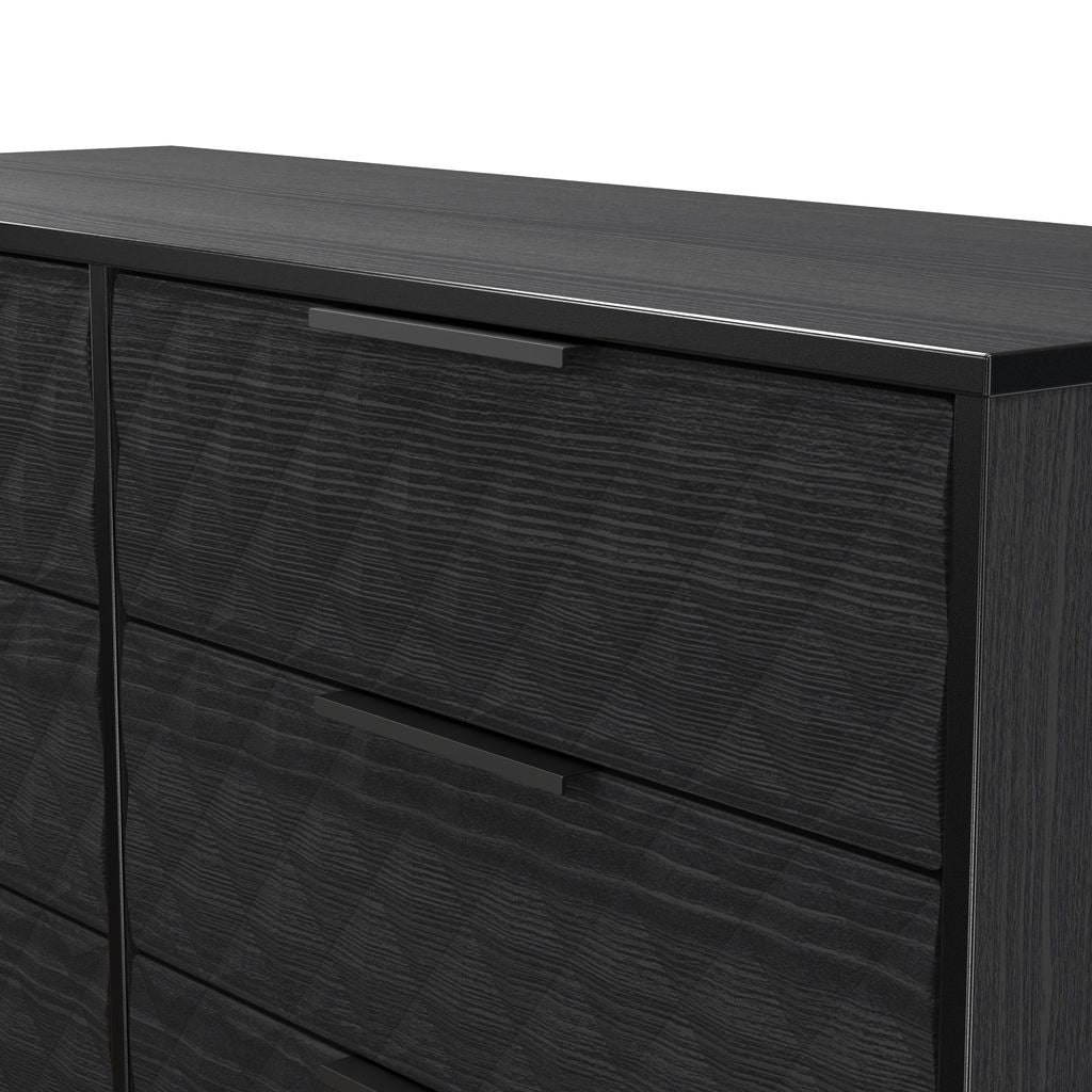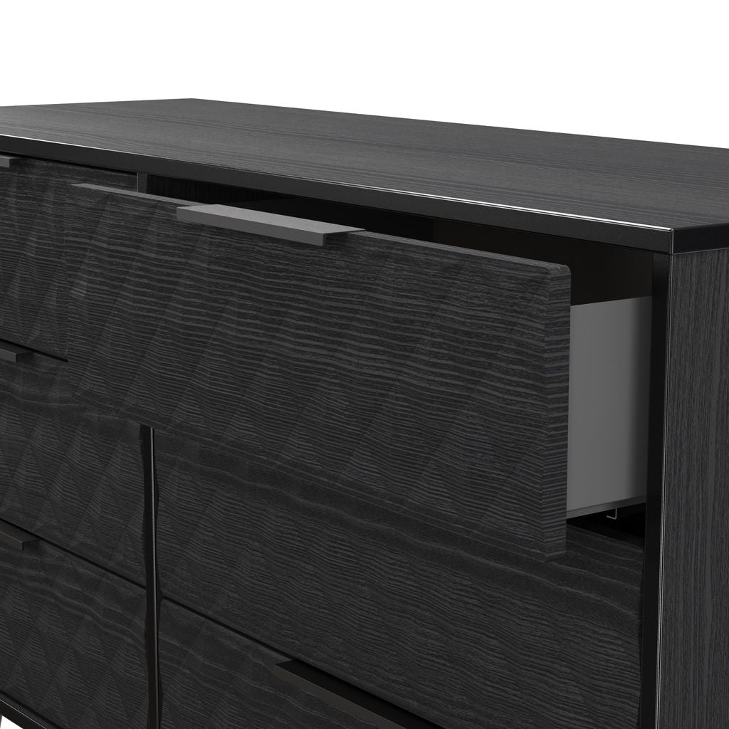Each piece features striking 3D geometric patterned fronts that add depth and texture, complemented by sleek black pull handles for a refined finish. The black hairpin legs on the bedside tables and chest introduce a retro-inspired touch while enhancing the contemporary feel of the set.