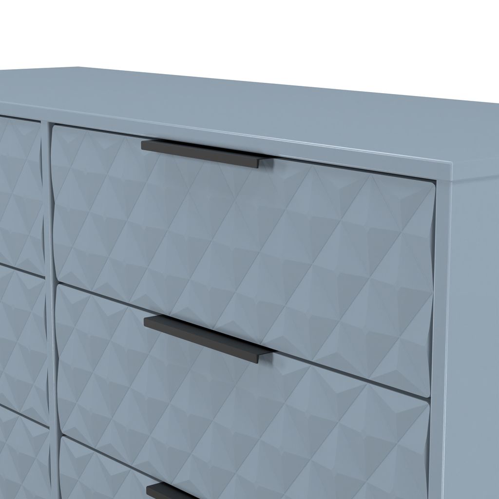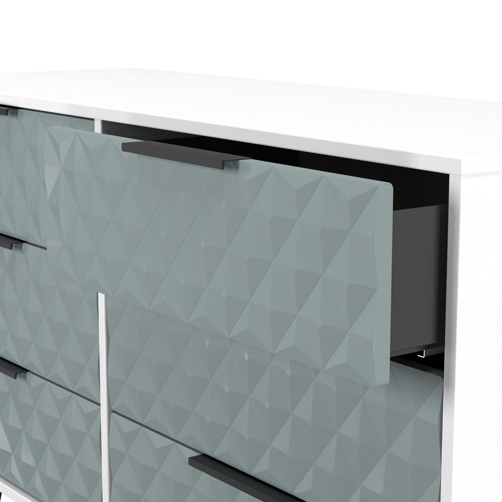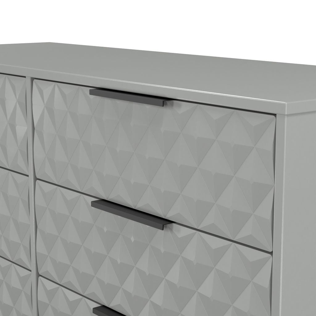 Each piece features striking 3D geometric patterned fronts that add depth and texture, complemented by sleek black pull handles for a refined finish. The black hairpin legs on the bedside tables and chest introduce a retro-inspired touch while enhancing the contemporary feel of the set.