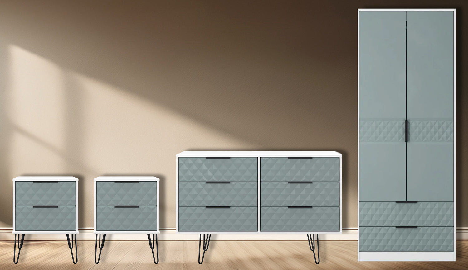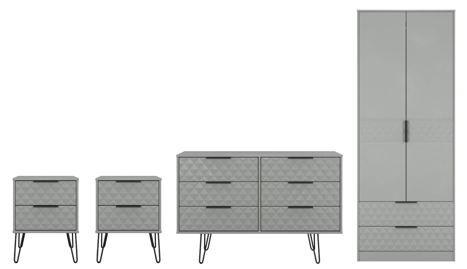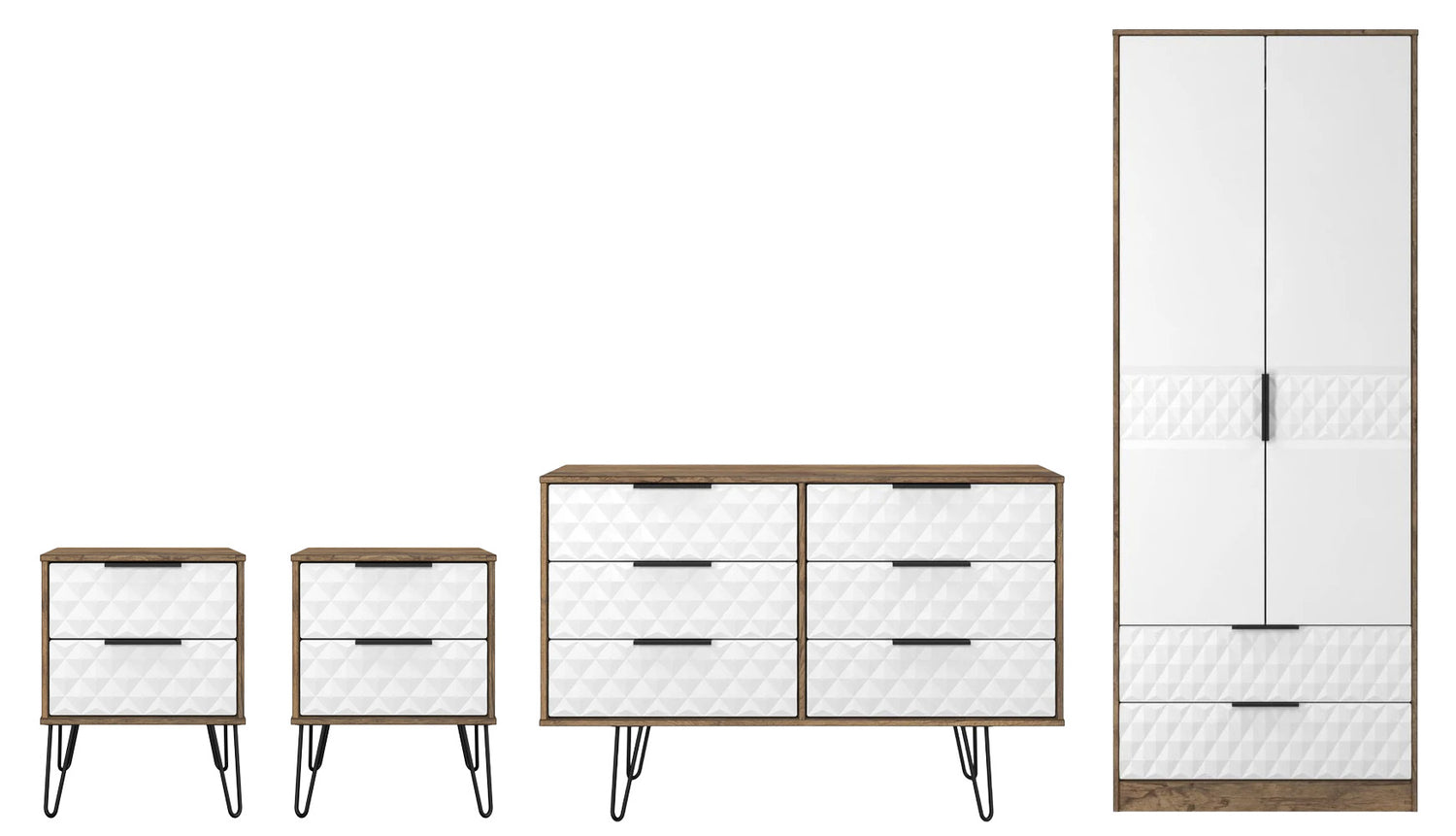 This complete set includes two 2 Drawer Bedside Tables, a 6 Drawer Chest of Drawers, and a 2 Door 2 Drawer Wardrobe, offering ample storage for clothes, linens, and everyday essentials, all while keeping your bedroom looking effortlessly stylish.