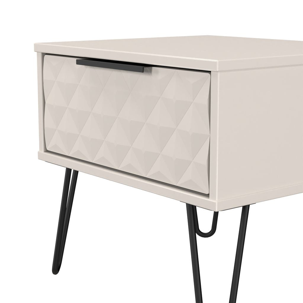 Featuring eye-catching 3D geometric patterned fronts, each piece is brought to life with sleek black pull handles and finished with black hairpin legs on the bedside tables and chest of drawers, adding a retro-inspired yet sophisticated touch.