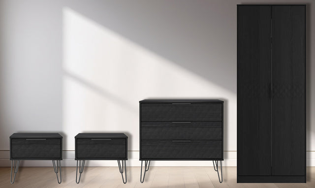 The Harlequin 4 Piece Bedroom Set with Black Hairpin Legs combines bold modern styling with practical storage, making it a standout choice for any contemporary bedroom. Available in two striking finishes – Black Ash or Kashmir Matt – this collection is designed to suit a wide range of interiors.