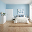 The Highbury White 3 Door Wardrobe 3 Piece Bedroom Set combines style and practicality, making it an ideal choice for any bedroom. The set includes a bedside table with a drawer and an open shelf, perfect for storing essentials and displaying decor. The wardrobe features a full width hanging rail and 5 shelves, providing ample storage for clothing. Completing the set, the 3 drawer chest offers generous space for folded items, with a tabletop perfect for displaying personal items. This versatile set seamlessly blends into any room, adding a clean and contemporary touch to both guest and primary bedrooms.