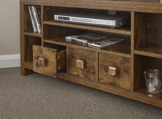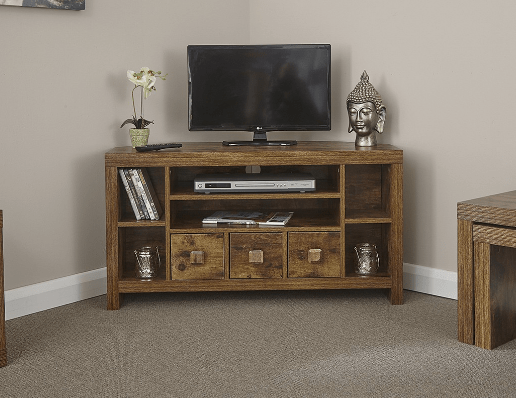 This Indian-inspired Tv Unitfits neatly into the corner of a room and is perfect for a room with limited space. This unit will hide all your cables, has drawers for storage and can house all your entertainment equipment.