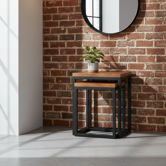 Add a touch of architectural flair and versatile functionality to your home with the Kenai Set of 2 Nesting Tables. These eye-catching pieces are masterfully crafted with chunky acacia wood table tops, showcasing the deep, swirling grains and rich natural tones that define the collection. Each table is supported by a sleek industrial black metal frame, creating a striking industrial and rustic style that serves as a sophisticated accent for any contemporary lounge or snug.