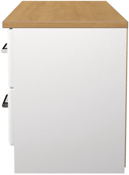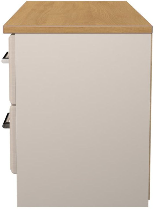 The Kent 4 Drawer Bed Box with Oak Top is a stylish and practical storage solution for your bedroom. Finished in dusk grey with a contrasting Bardolino oak top, this piece combines traditional edge finishes with a retro-inspired look. Featuring four spacious drawers with brushed steel handles, it offers plenty of room for keeping clothes, bedding, or accessories neatly organised. Ready assembled and available in three other colours, this bed box is both functional and beautifully designed to complement a range of interiors.