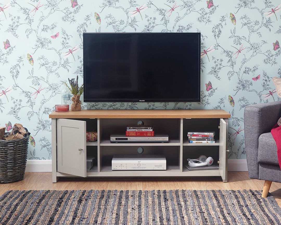 This stunning tv unit in its soft grey and oak effect top would be the perfect fit in acontemporary or traditional setting. With itsdouble shelf and rear cable entry it offers plenty of space for DVD/TV boxes. With a double cupboard to provide storage for manuals, remotes or DVDs making this a practical piece of furniture for your living space.