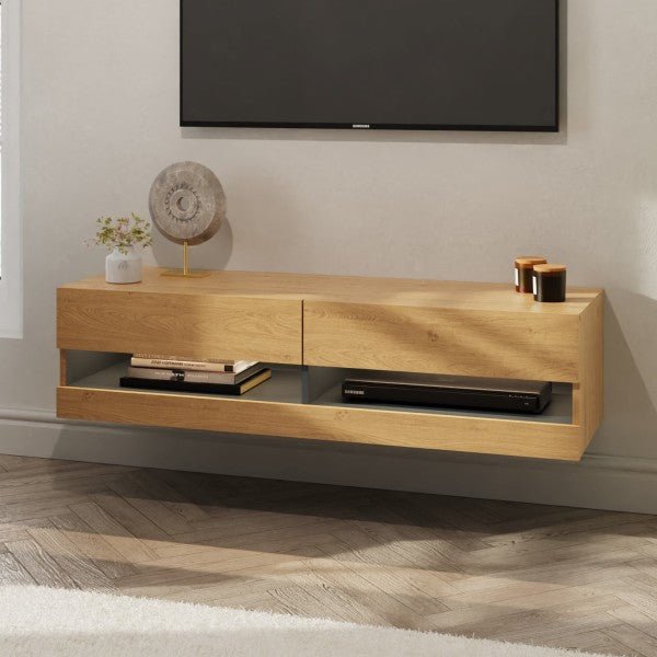 Store your audio and video equipment in style with the Leon wall-mounted storage unit. Perfect for your flat-screen TV, this dual-compartment unit features a minimalist design. The top surface offers space for accessories, while an LED downlight enhances its sleek, open slot construction.
