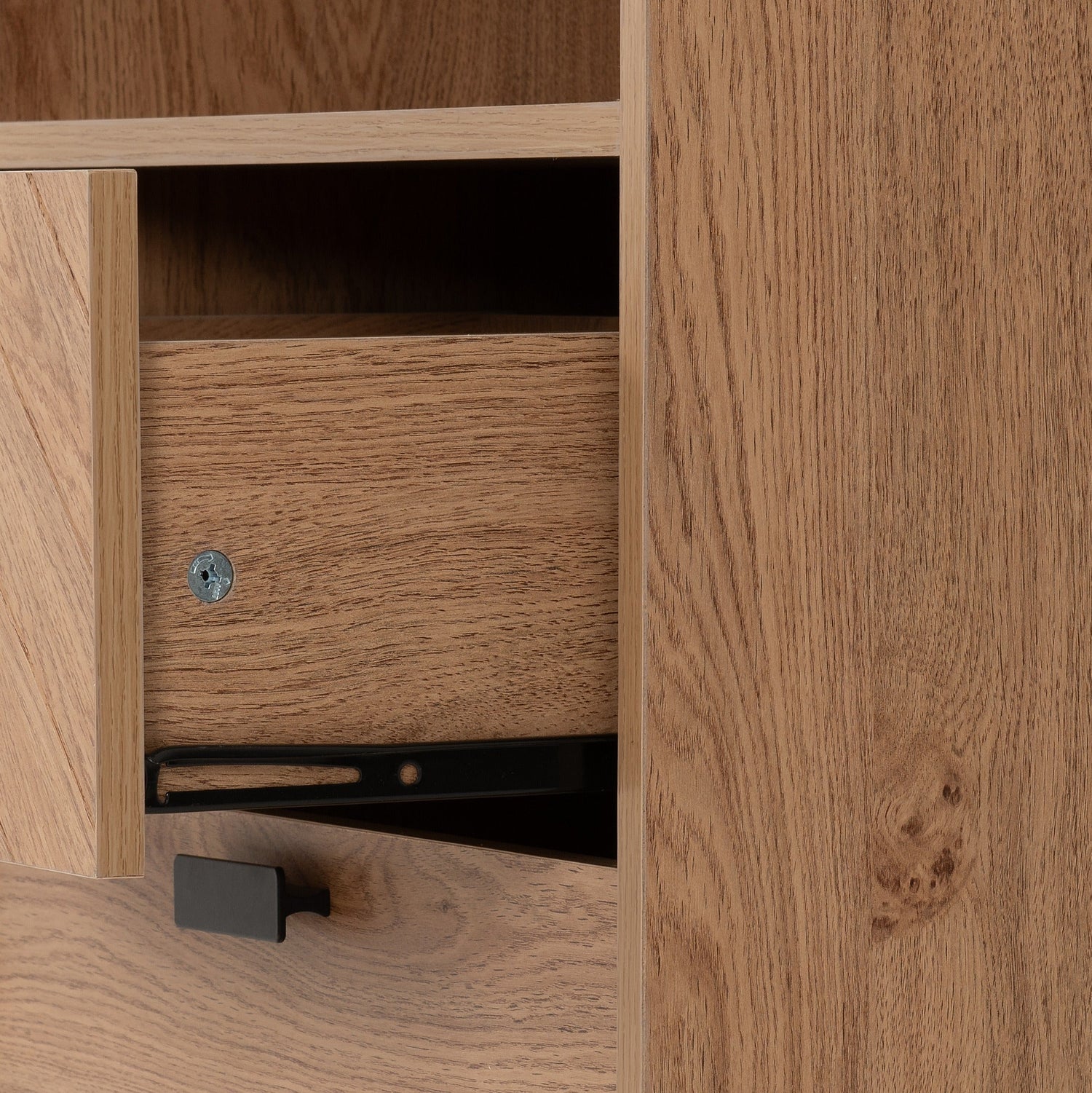 A stylish blend of timeless design and practicality, this cabinet features a chic herringbone oak pattern, 2 shelves and 2 drawers for ample storage. The retro-inspired look is accentuated by sleek black metal handles, adding a modern touch. With its durable construction, this cabinet is a versatile and stylish solution for organising and displaying items in any room.
