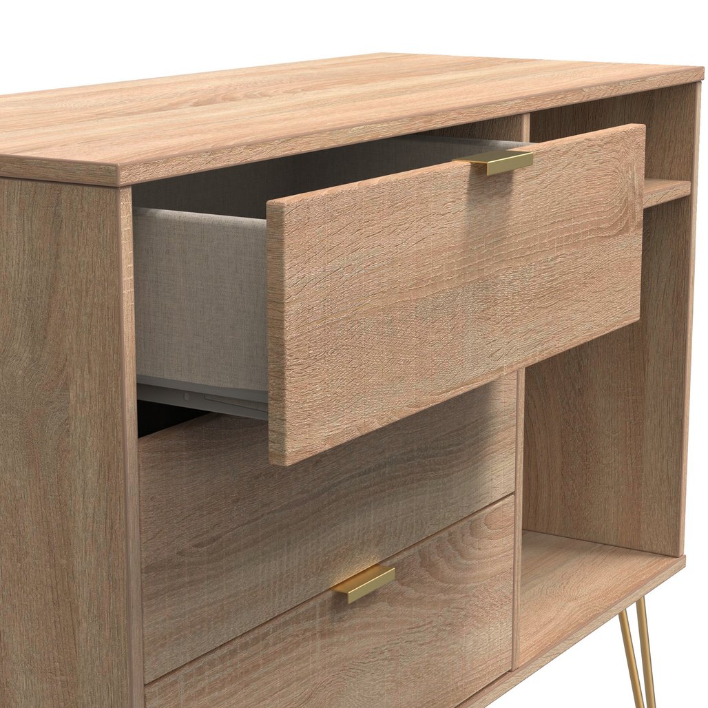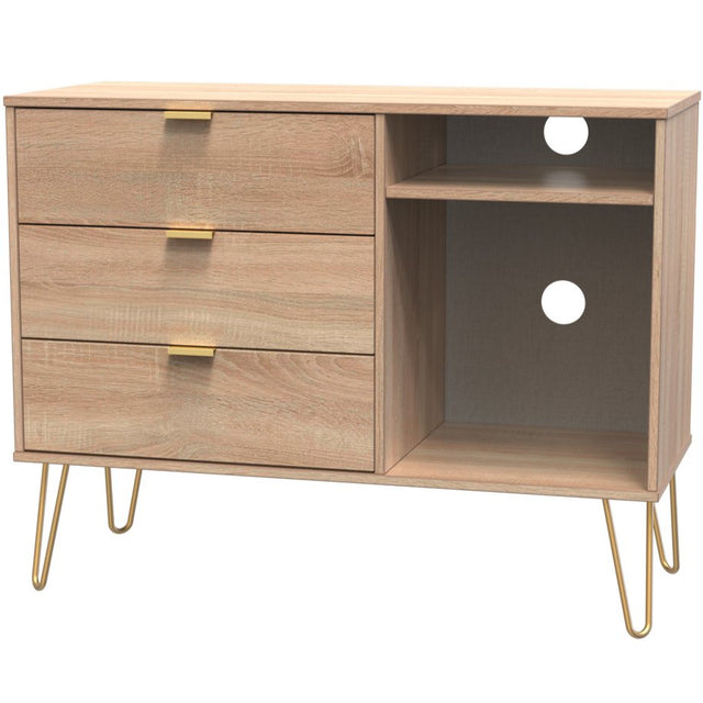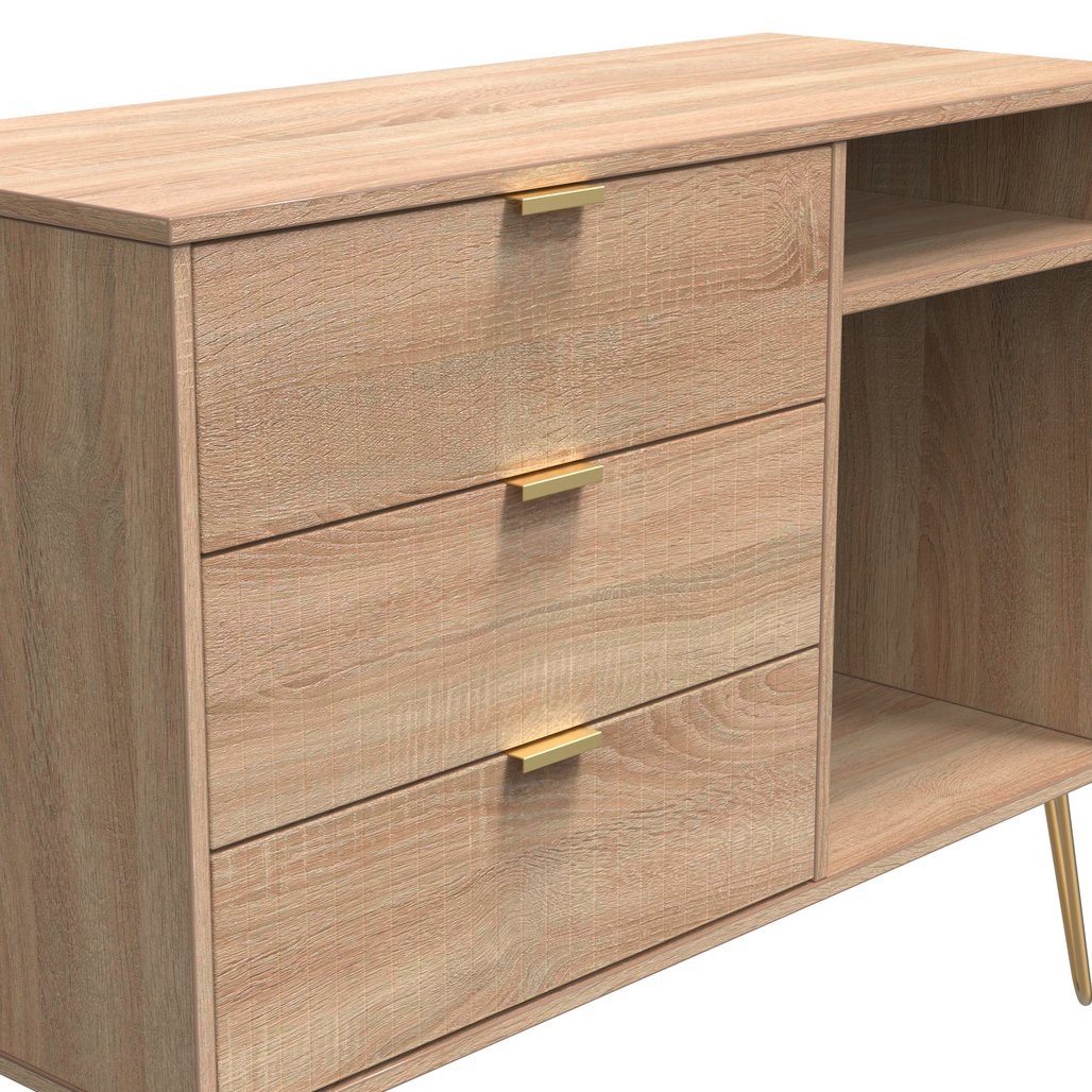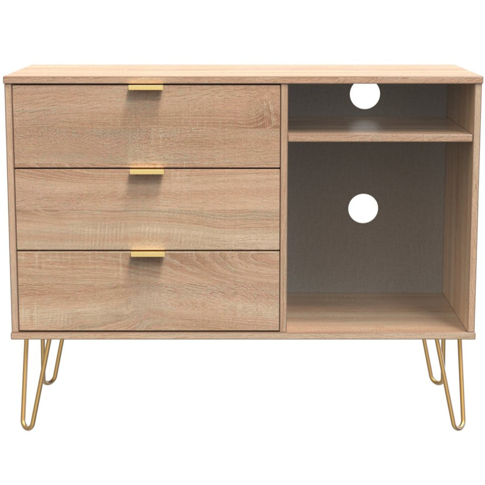 Linear 3 Drawer Open Shelf TV Unit with Gold Hairpin Legs - Light Oak is backordered and will ship as soon as it is back in stock.