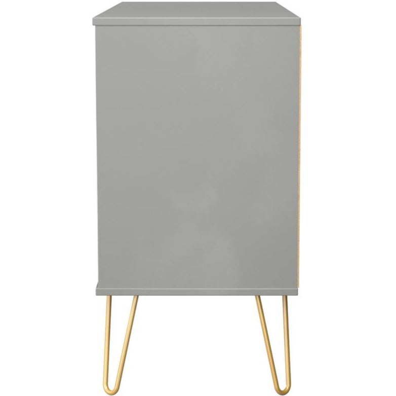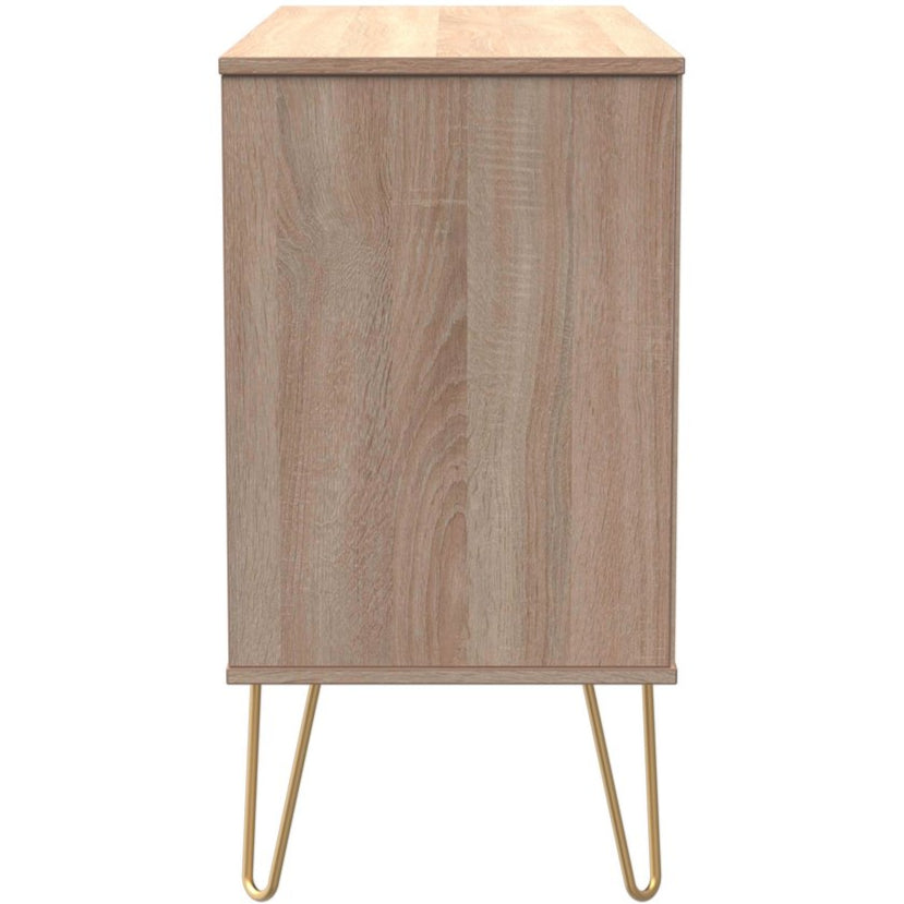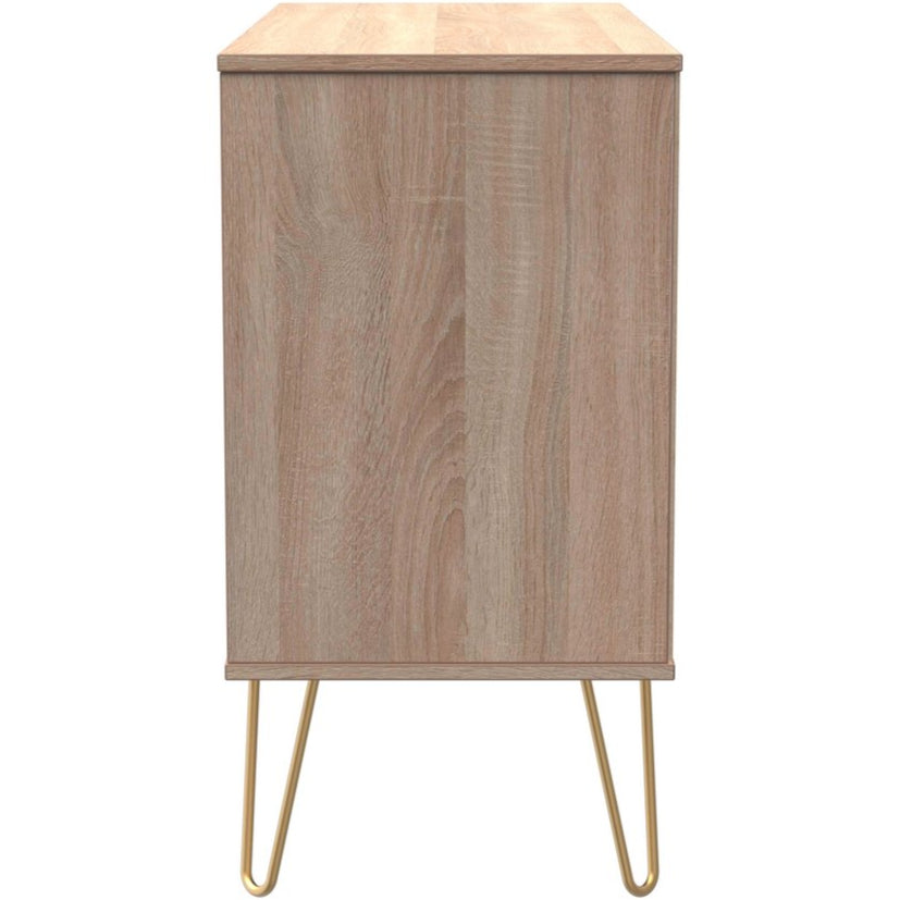 Elevate your entertainment space with the stylish Linear 3 Drawer Bardolino Oak TV Unit, designed with a modern Scandi flair. Ready assembled for immediate use, it features elegant gold hairpin legs and matching gold handles that add a touch of sophistication to any room.