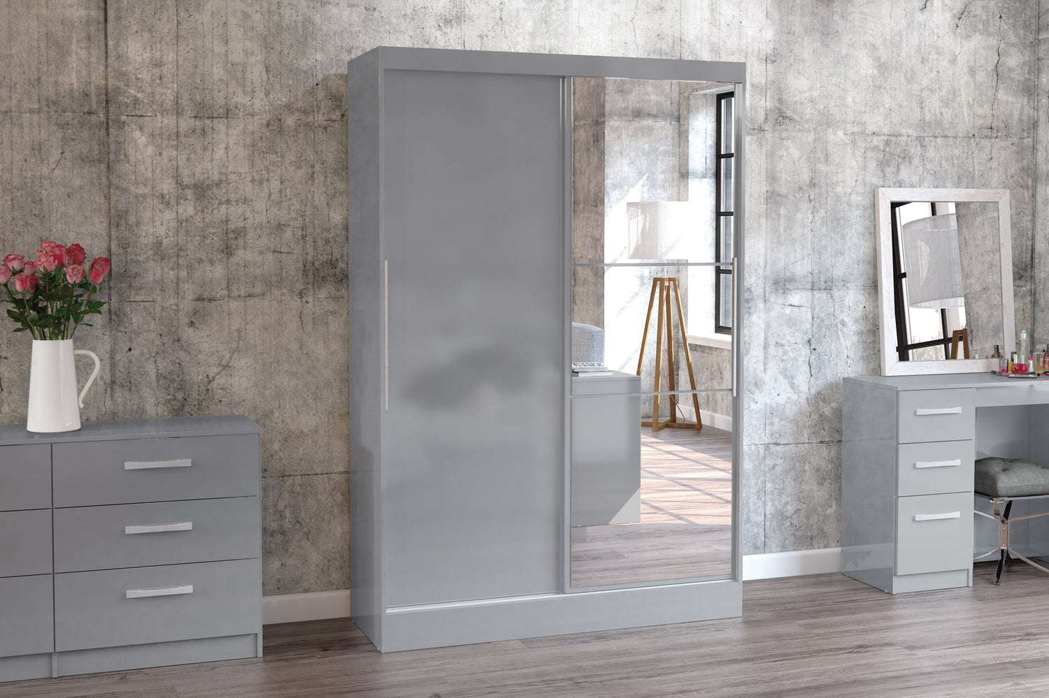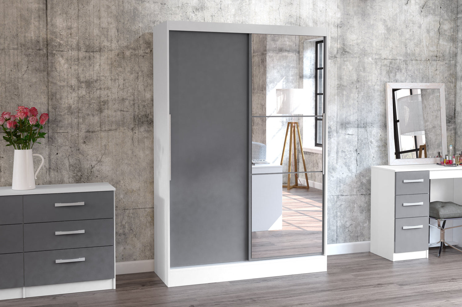 Lynx 2 Door Sliding Mirrored Wardrobe - White and Grey Gloss is backordered and will ship as soon as it is back in stock.