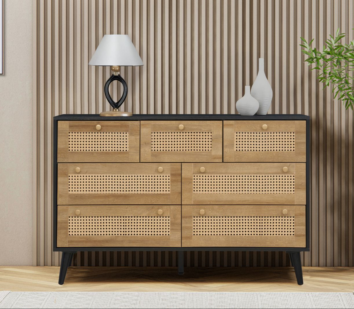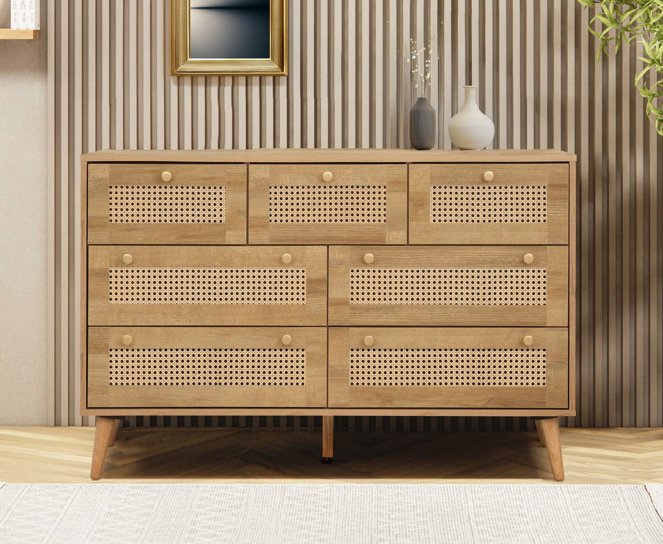 Each drawer is finished with PVC rattan fronts, giving the piece a light, airy feel perfect for boho, coastal, or relaxed modern interiors.