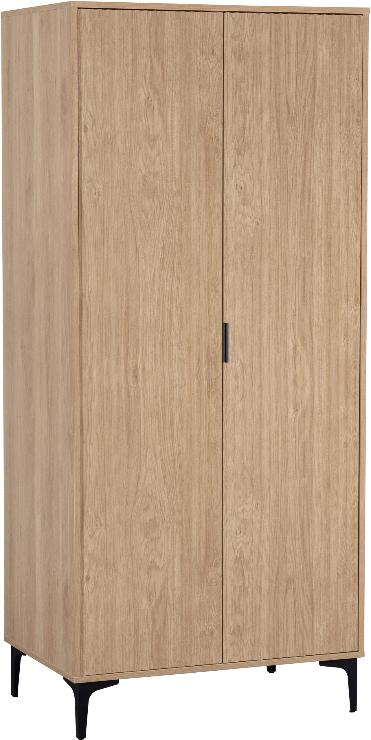 The Miami wardrobe is as practical as it is beautiful, featuring a full-width hanging rail for garments and a convenient upper shelf for folded items, bedding, or accessories. Available in two expertly curated colourways, you can choose the Oak effect with black legs and handles for a warm, organic atmosphere, or the White finish with gold-toned hardware for a bright, luxe look that radiates modern glamour.
