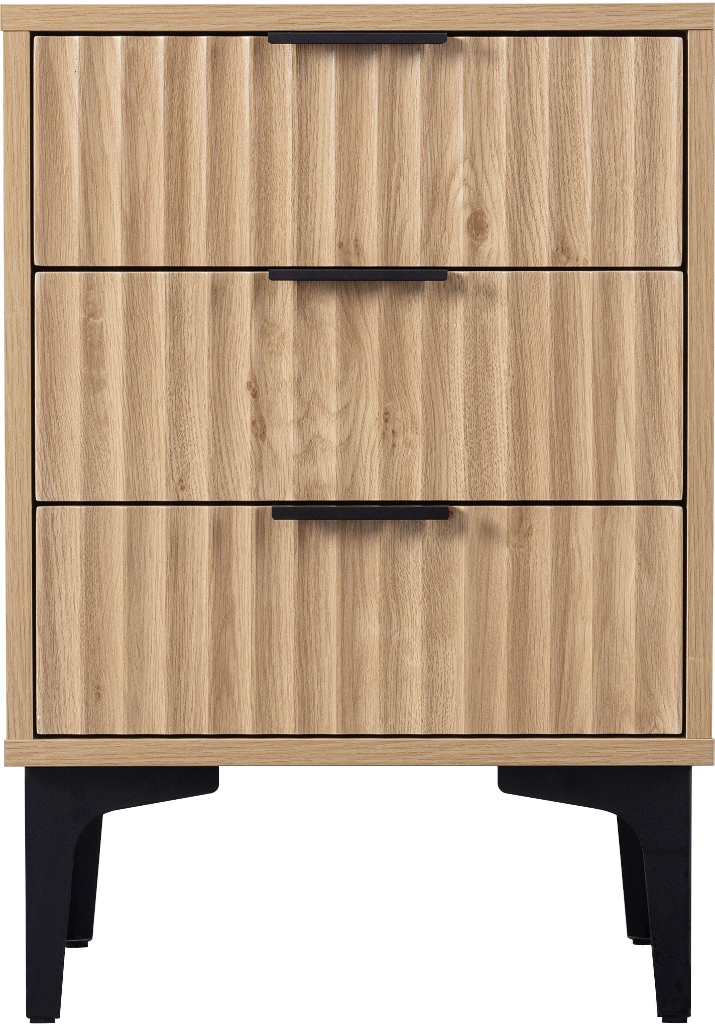 Miami Ridged 3 Drawer Fluted Bedside Table - Oak and Black is backordered and will ship as soon as it is back in stock.