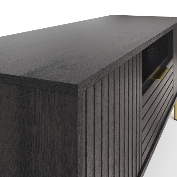 Experience the extraordinary with the Nervata Range. Immerse yourself in the captivating charm of the Nervata TV Unit, meticulously crafted with woodgrain dimpled foil and accentuated by mesmerizing gold details. The sleek black and gold color palette invites you into the realm of an enchanting art deco pavilion, making it a striking centerpiece for your living space. Whether it's the coffee table, lamp table, sideboard, or TV unit, every item embodies the perfect fusion of elegance and functionality.