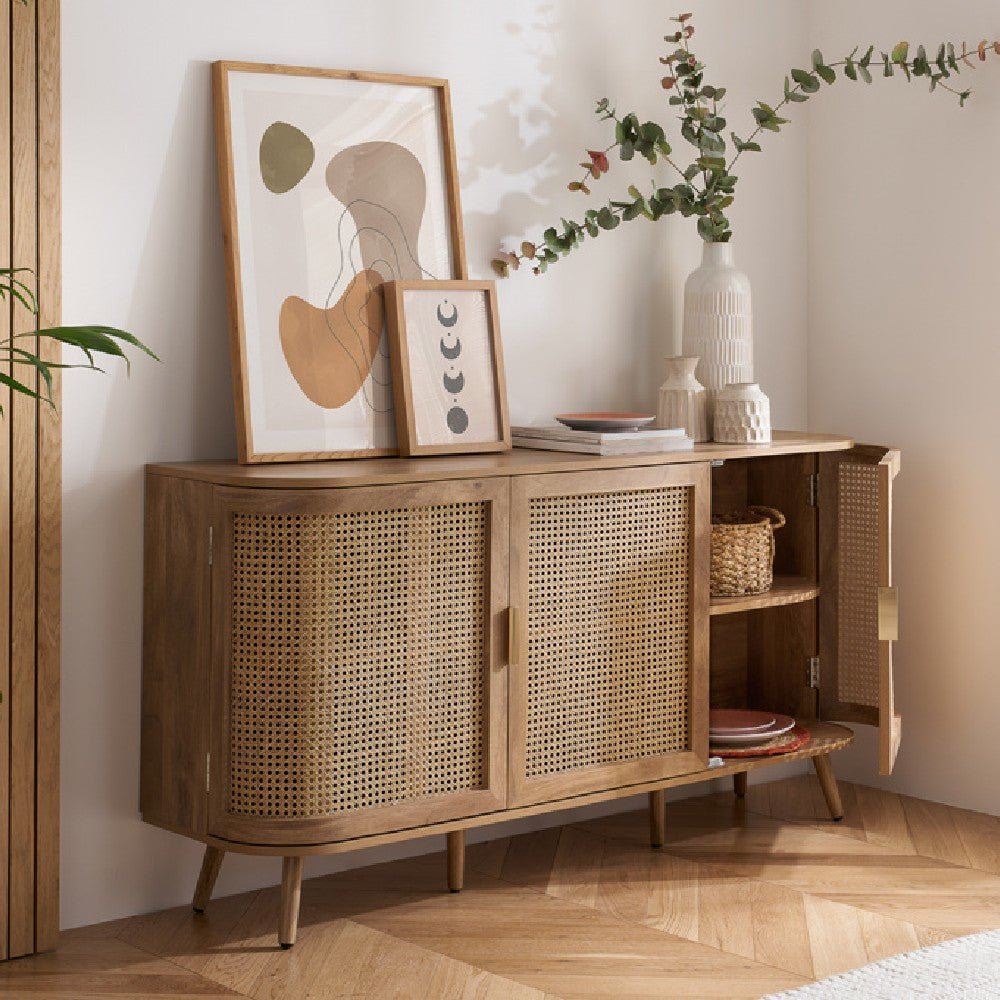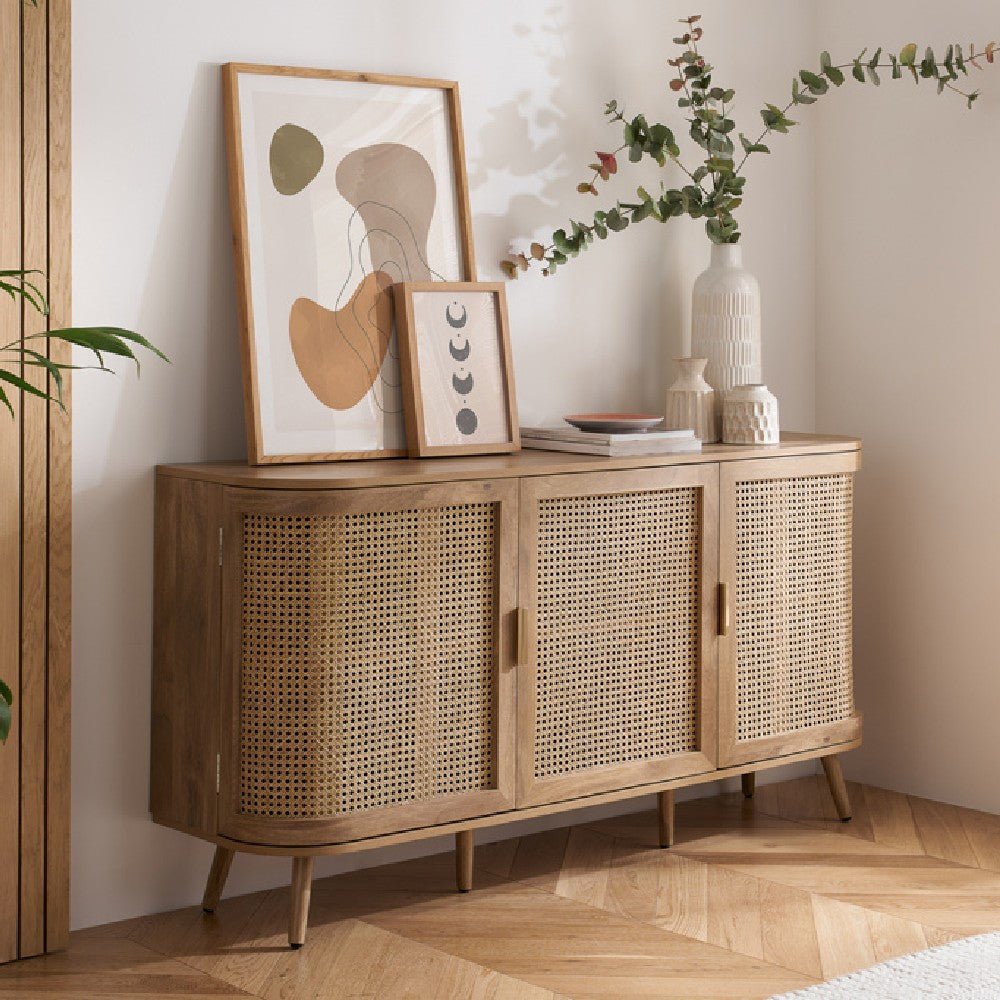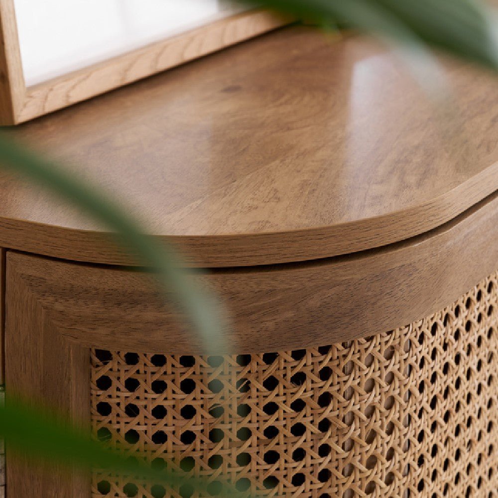 Discover timeless sophistication with the exquisite Noah sideboard. This stunning piece seamlessly blends traditional artisanship with contemporary aesthetics, bringing a touch of serene refinement to any living space. Each curve of the sideboard is gently softened, complemented by delicate bevels that exude modernity. The intricately woven rattan front adds an eye-catching yet gracefully reserved pattern. With its warm, neutral palette and smooth wooden surfaces, the Noah sideboard offers versatility and invites a tactile experience. Ideal for those who appreciate subtle design, this piece promises to elevate your home with its timeless charm and a hint of modern allure.