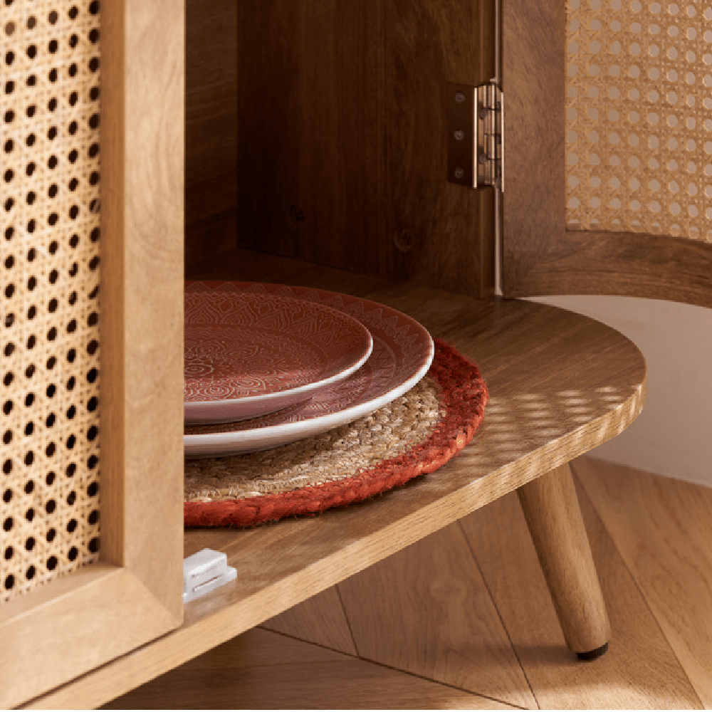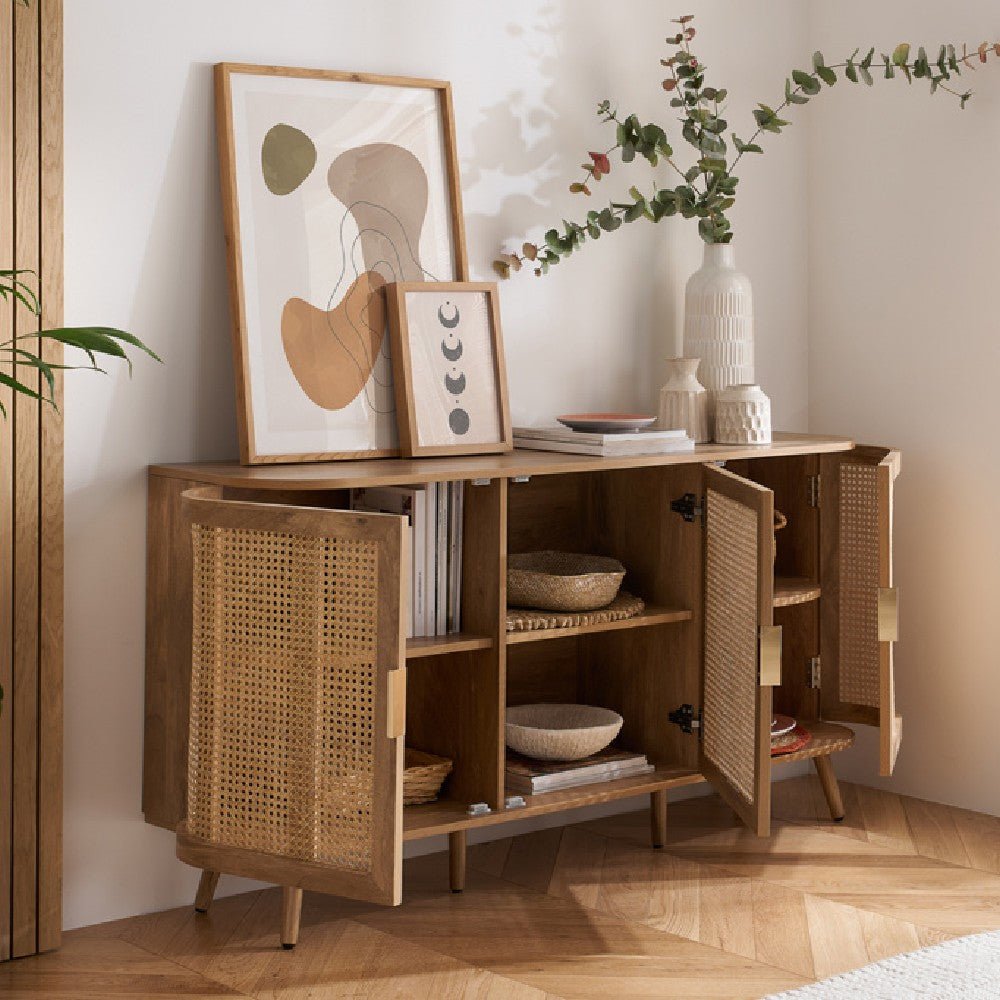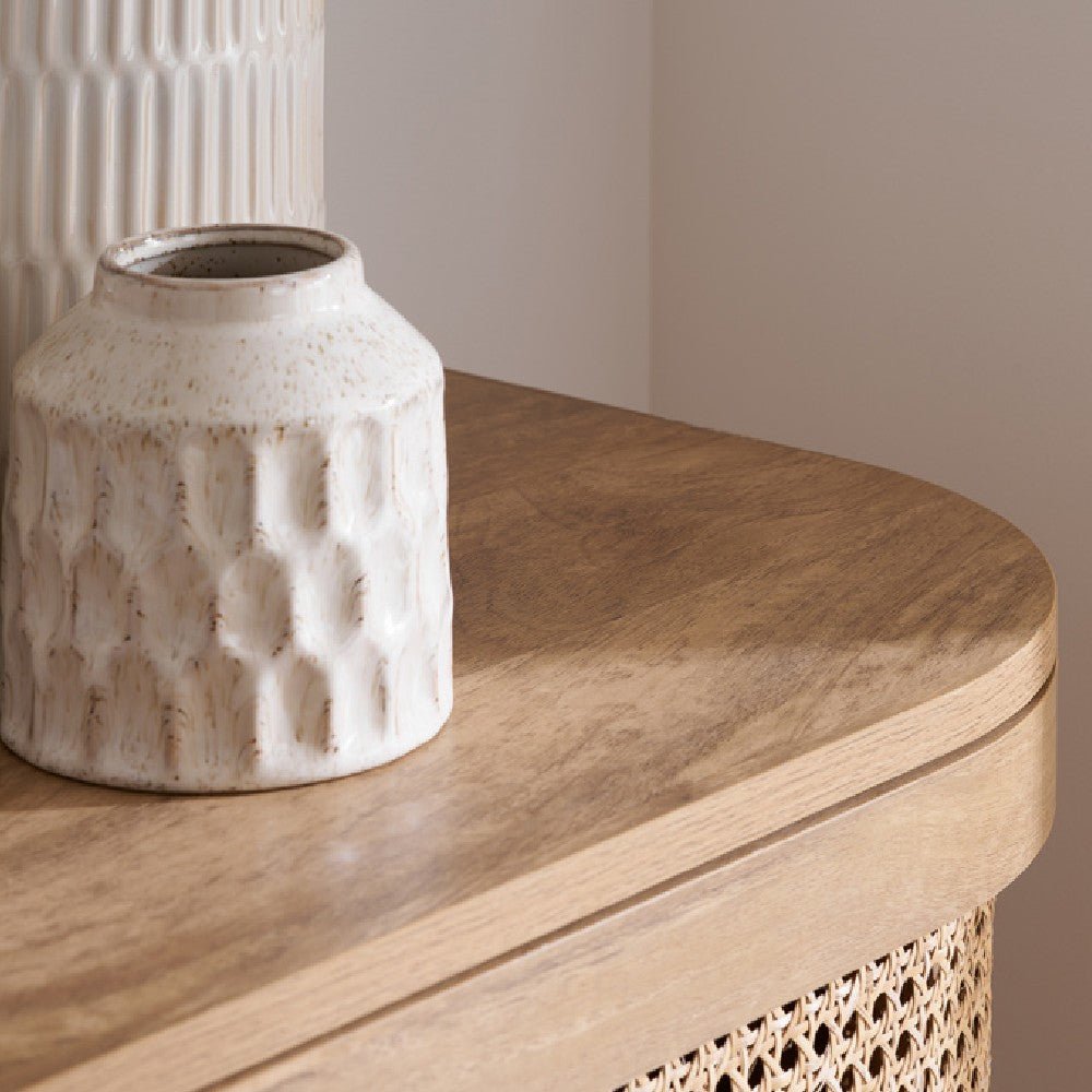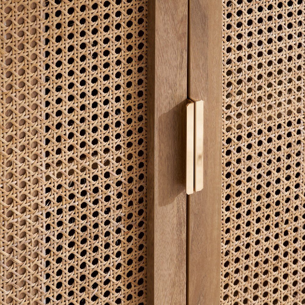 Discover timeless sophistication with the exquisite Noah sideboard. This stunning piece seamlessly blends traditional artisanship with contemporary aesthetics, bringing a touch of serene refinement to any living space. Each curve of the sideboard is gently softened, complemented by delicate bevels that exude modernity. The intricately woven rattan front adds an eye-catching yet gracefully reserved pattern. With its warm, neutral palette and smooth wooden surfaces, the Noah sideboard offers versatility and invites a tactile experience. Ideal for those who appreciate subtle design, this piece promises to elevate your home with its timeless charm and a hint of modern allure.