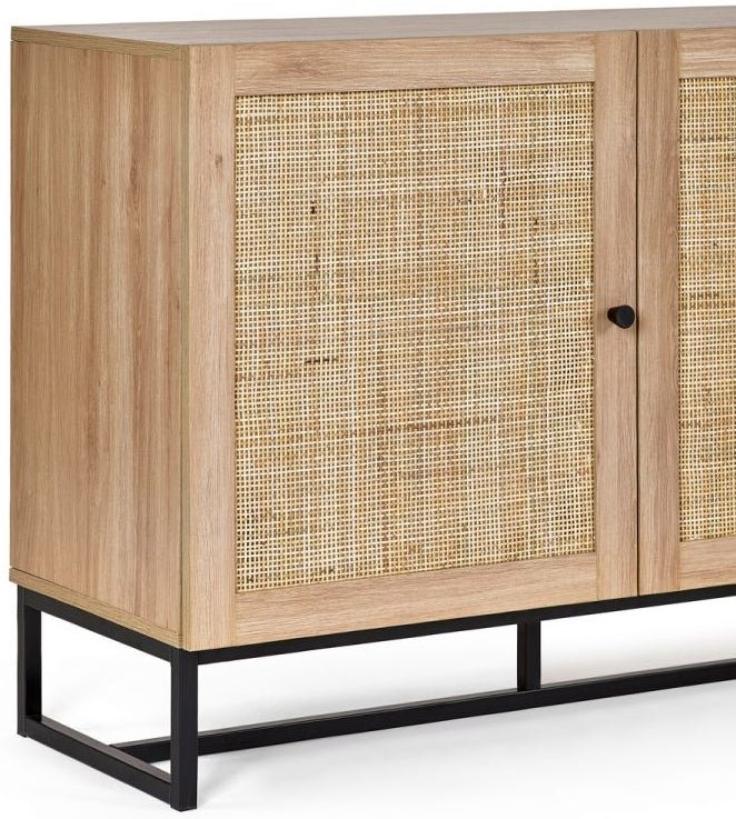 Mixing modern construction with retro design elements, the Padstow collection will complement any home. Natural rattan fronts coupled with industrial-style metal frames perfectly collaborate to create a warm yet chic aesthetic in your home. This range also includes bedside chests, 3 drawer chests, 6 drawer chests, wardrobes, coffee tables, TV units, and tall bookcases in both oak effect or black finishes.