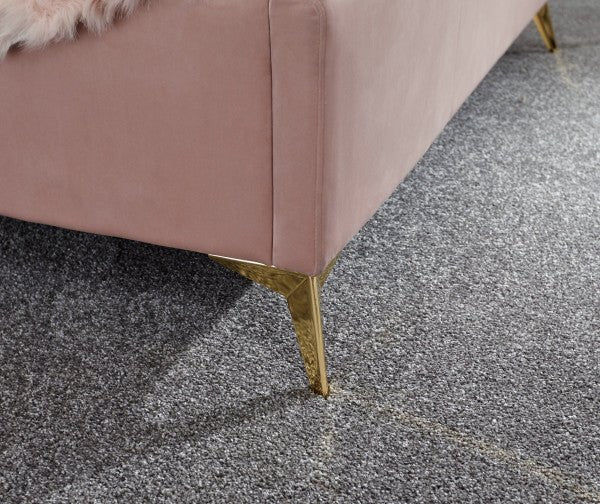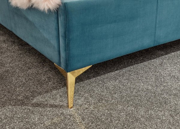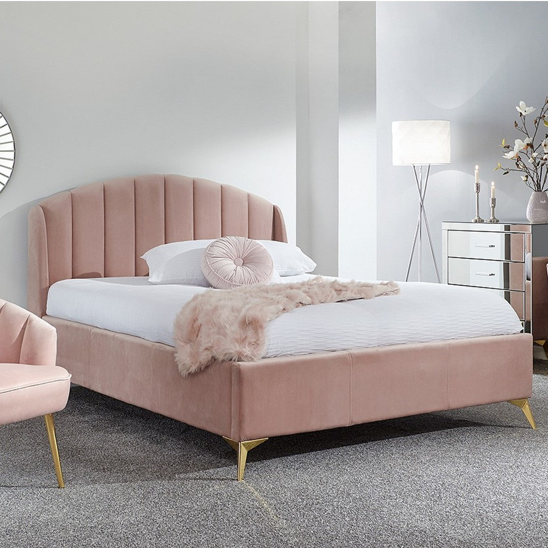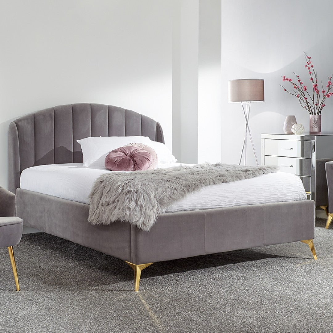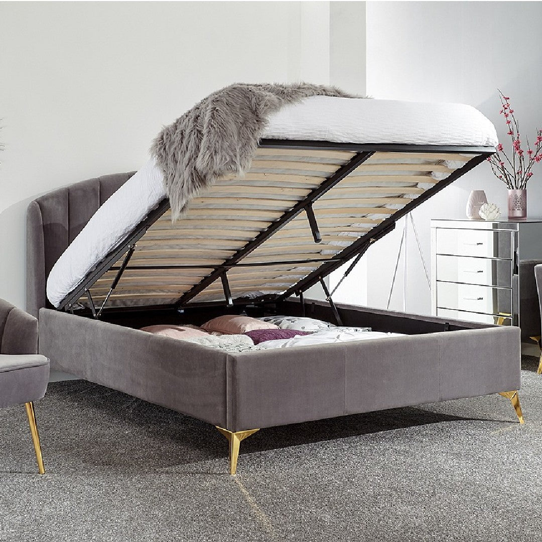 Transform your bedroom into a romantic boudoir with our wonderful 4'6" Double Pettine ottoman bed frame in grey. The softly padded velvet frame and heavy-duty sprung slat system provides a sturdy base for your mattress and the headboard’s winged scalloped shelldesign gives a comfortable padded finish. The angled gold-effect metal legs offer a contemporary yet classic feel. Hydraulic pistons allow the slatted base to lift with ease, revealing a storage compartment beneath.