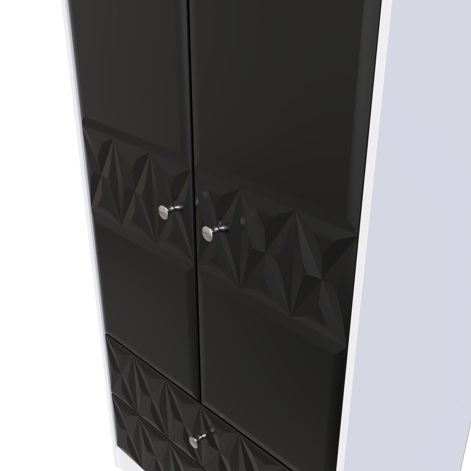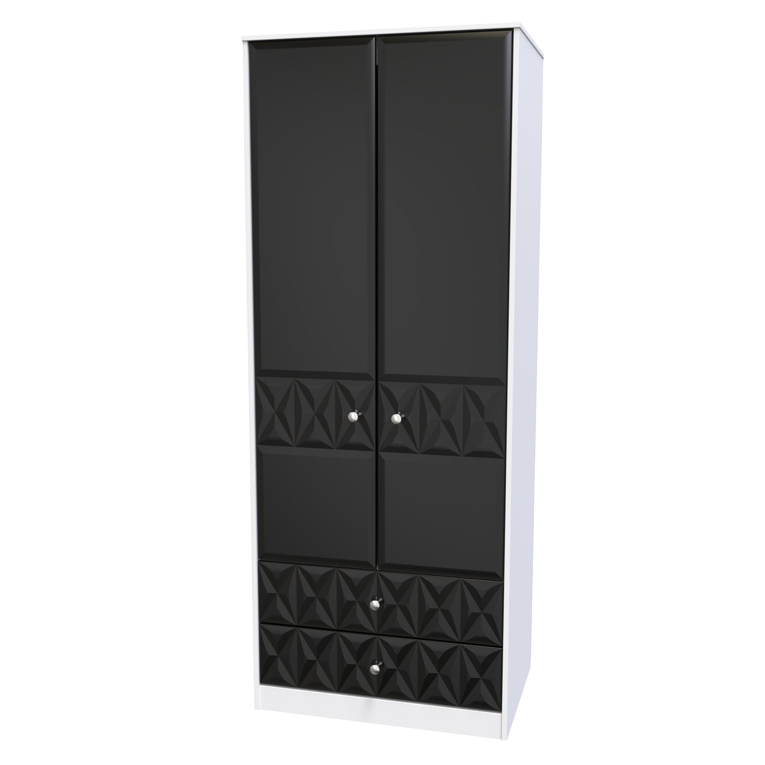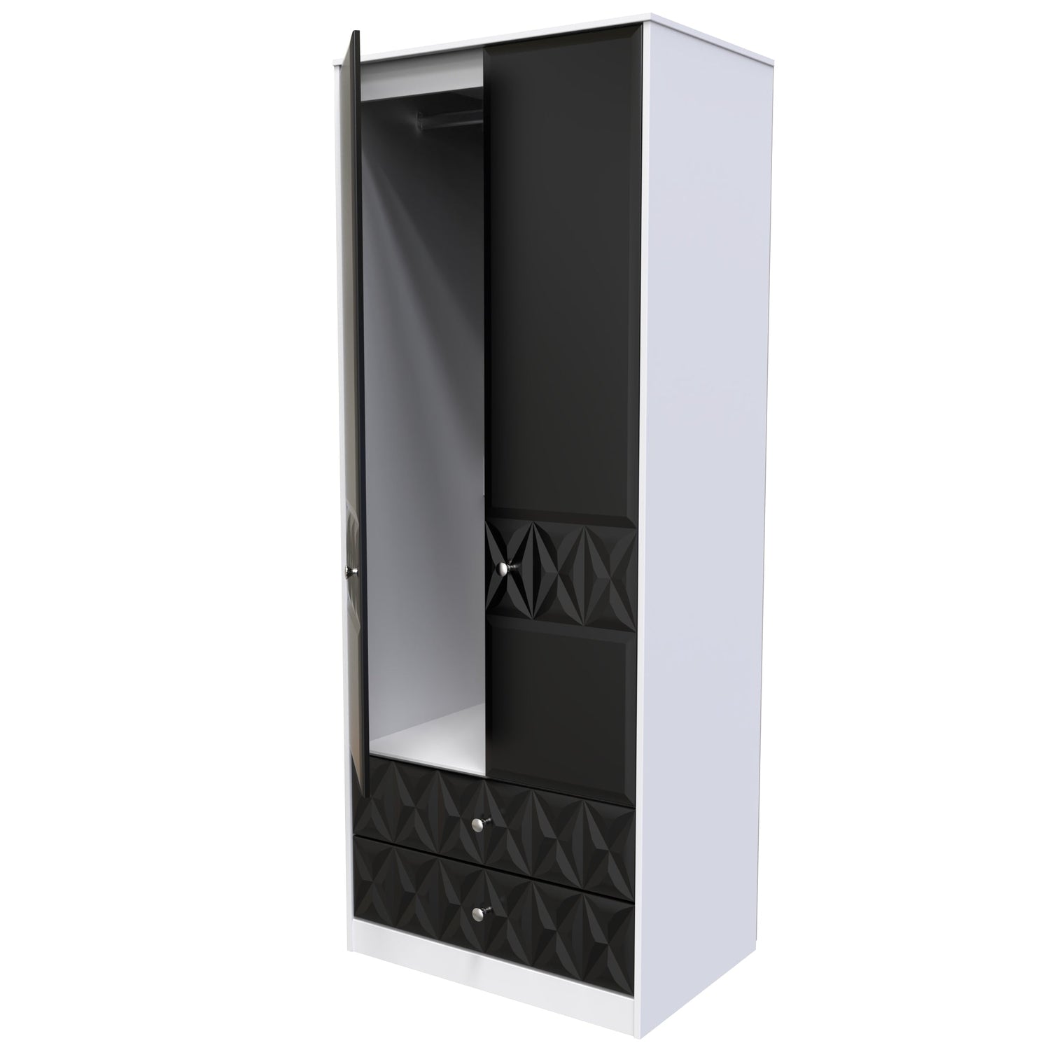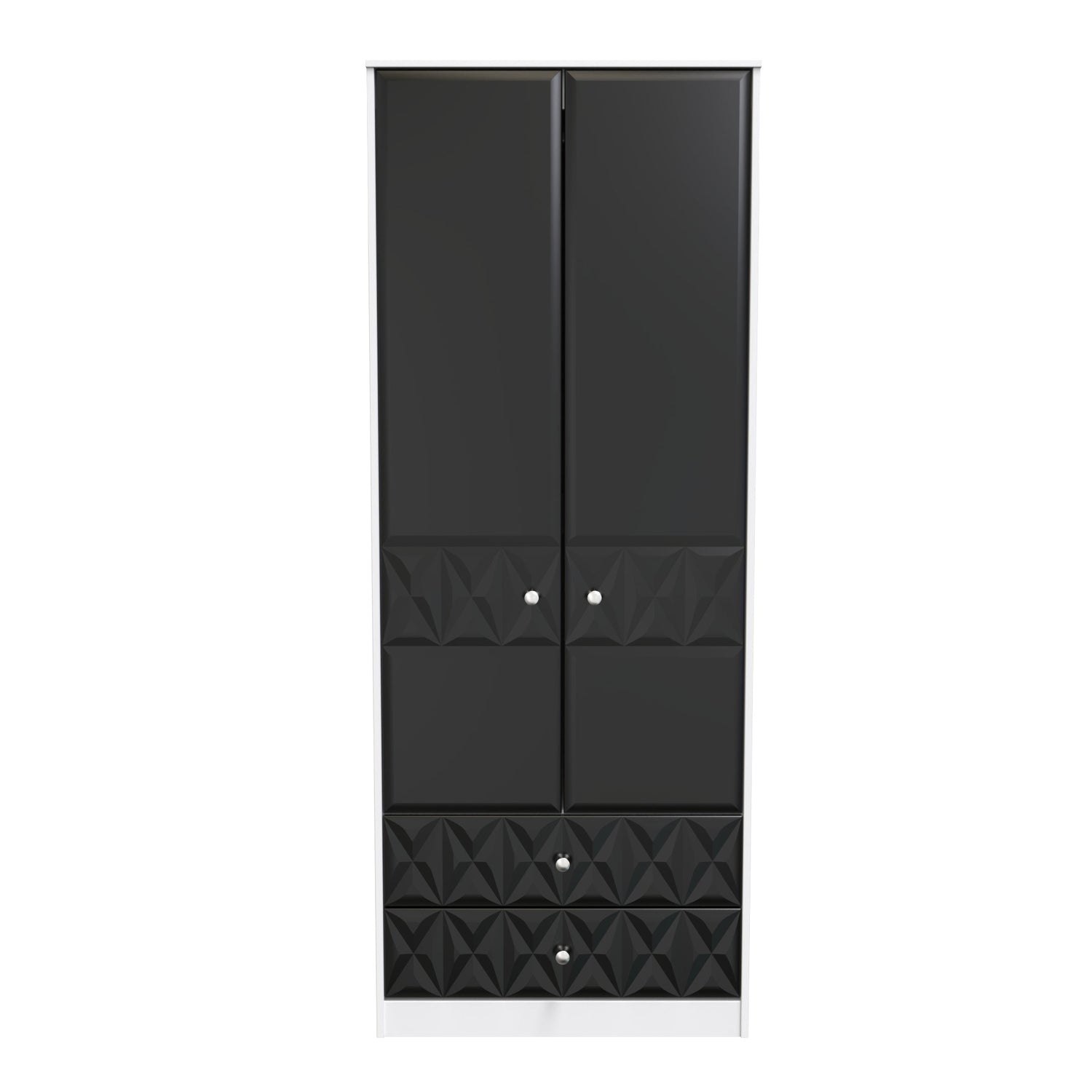 With its sleek and contemporary design, the Pixel Textured Black and White 2 Door 2 Drawer Wardrobe is the perfect choice for those who appreciate both style and functionality - its simple, minimal and yet elegant design blends effortlessly into any room interior. Two doors conceal a full width hanging rail and shelf, providing ample storage space for all your clothing. Delivered assembled, this range is a hassle-free addition to your bedroom - just add the provided legs and handles!