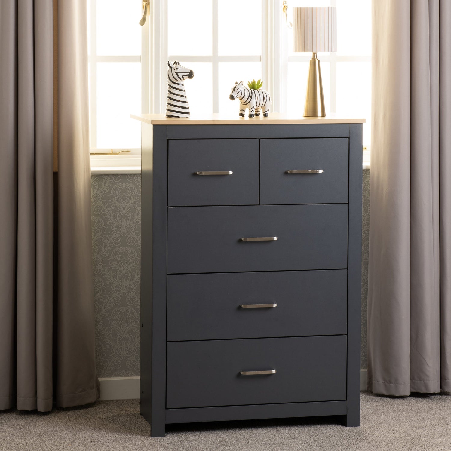 Introducing the elegant Portland Grey and Oak 3+2 Drawer Chest from our stunning Portland collection. This drawer chest seamlessly integrates into any home decor. Its timeless oak effect top adds a touch of tradition, while the sleek modern grey finish enhances its contemporary appeal. With five spacious drawers, this unit offers ample storage for your essentials. Order now and enjoy next working day delivery if in stock and ordered before 12pm!
