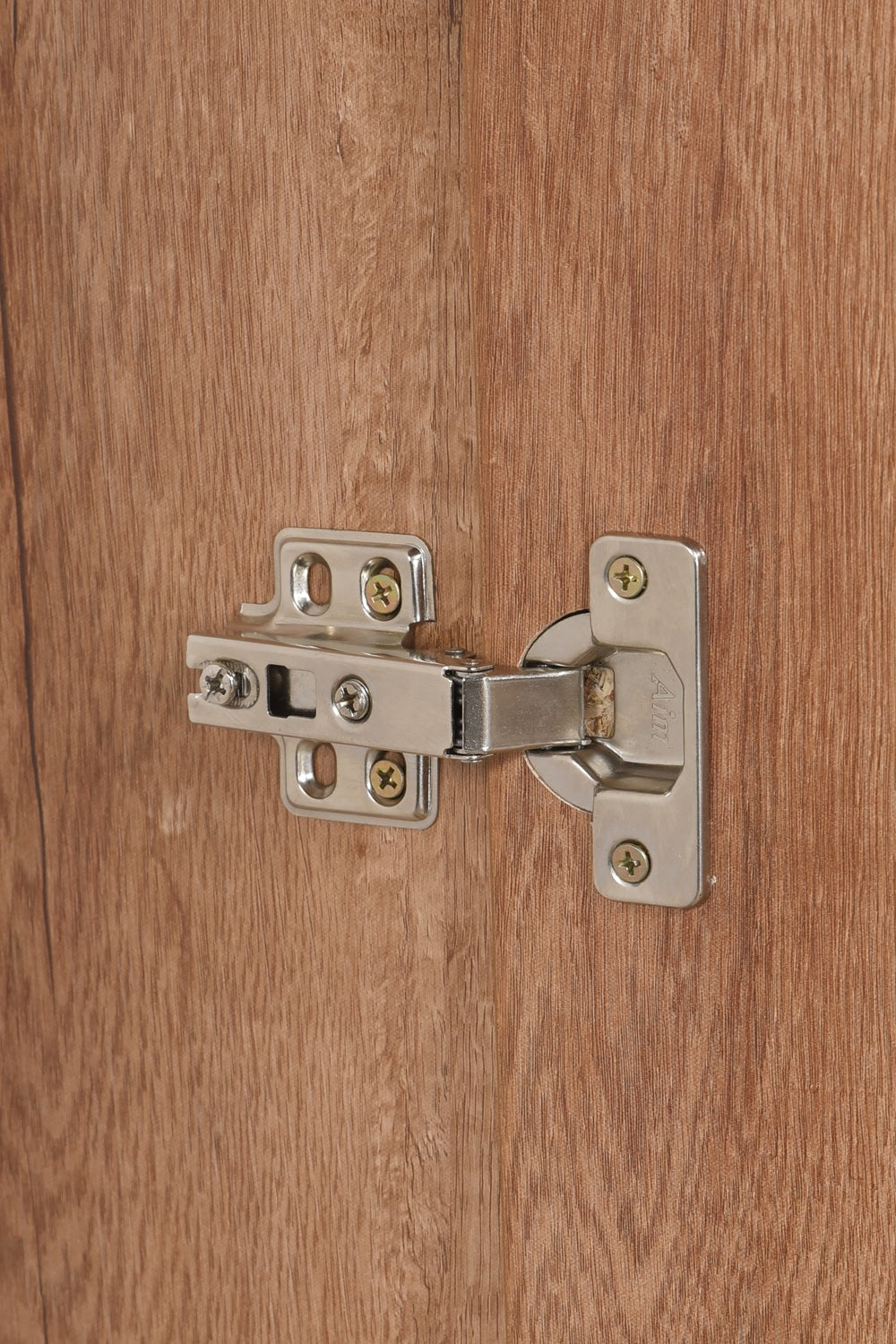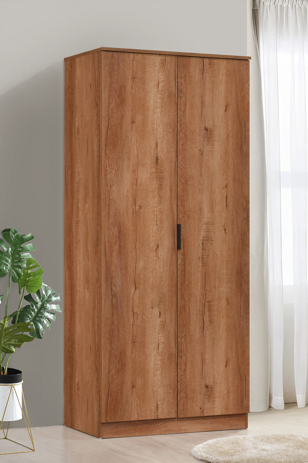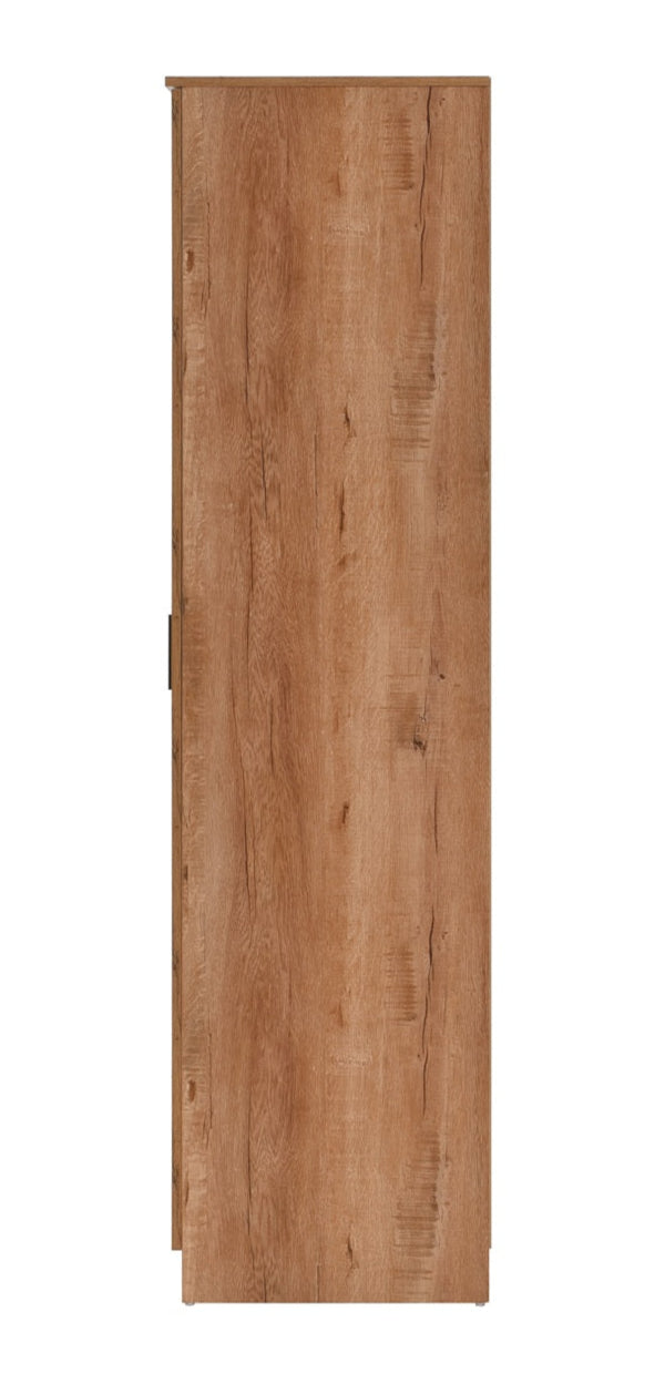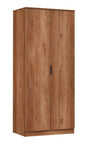 Crafted from durable engineered wood, the warm Chestnut Oak adds a touch of natural charm, while the brushed black metal handles provide a contemporary edge. Behind the two smooth-opening doors, you'll find a spacious interior complete with a sturdy hanging rail for clothes and a full-width top shelf—perfect for storing folded garments, boxes, or seasonal essentials.