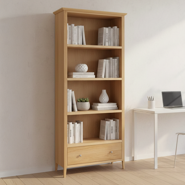 Standing tall with a refined silhouette, this bookcase features the signature Saxon rounded edges and elegant tapered legs, which soften its large proportions and give it a sophisticated, contemporary feel. The unit is equipped with four wide, sturdy shelves, offering ample vertical space for everything from tall hardback books to decorative items. Adding to its versatility is a spacious drawer at the base, providing a discreet place to store stationery, documents, or household essentials, keeping your living space looking tidy and intentional.