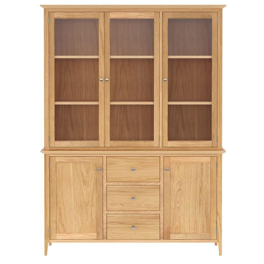 This impressive unit offers a sophisticated tiered storage system to help you organise your home with ease. The upper section features three glazed doors, allowing you to showcase your finest glassware, ceramics, or collectibles in a clear, dust-free environment. Beneath, three deep drawers and two solid oak doors provide generous concealed storage for larger items, linens, or everyday essentials. Following the signature Saxon aesthetic, the cabinet is finished with rounded edges and tapered legs, and comes supplied with both silver and wooden handles, allowing you to customise the look to perfectly match your decor.