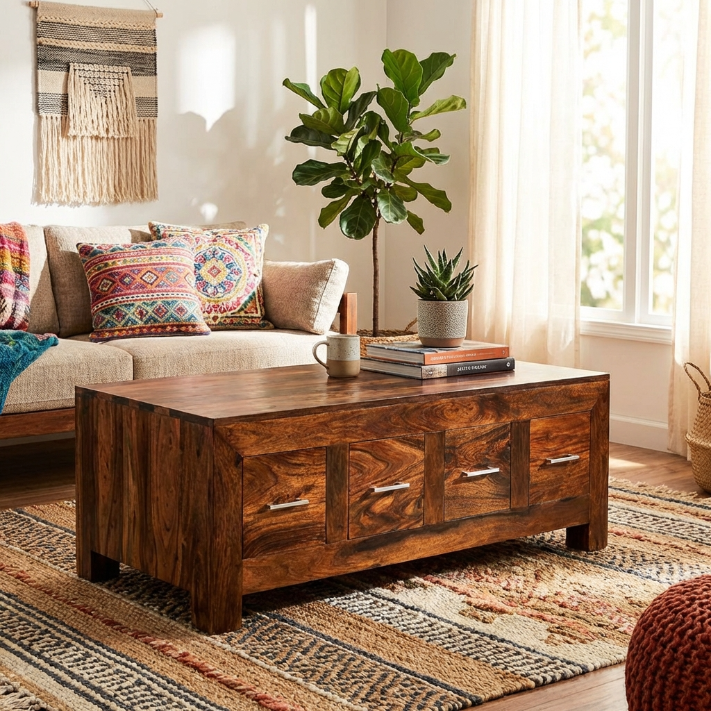 The Sequoia 8 Drawer Coffee Trunk is crafted from dark sheesham wood, showcasing bold natural grains that combine rustic charm with contemporary style. This statement piece features four drawers on each side, offering ample storage for living room essentials, while its distinctive handcrafted design makes it a standout in any space. Comes fully assembled for convenience.
