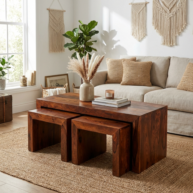 The Sequoia Long John Nesting Coffee Table is crafted from dark sheesham wood, highlighting bold natural grains for a look that blends rustic charm with contemporary style. This versatile piece features a long main table with two smaller nesting tables, perfect for compact spaces while offering flexible functionality.