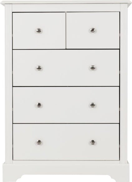 Featuring three large drawers for bulkier items like clothing and bedding, along with two smaller drawers for accessories or everyday essentials, this chest provides versatile storage options. The sturdy surface is ideal for displaying décor, a lamp, or personal items, while the white finish adds a bright and fresh touch to your space.