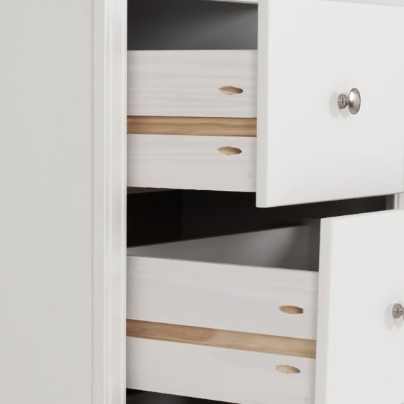 The Stratford 3+2 Drawer Chest in white combines sleek design with practical storage, making it a perfect addition to any bedroom or living space. With its modern look and clean lines, this chest complements a variety of interiors while offering ample room to keep your belongings organised.