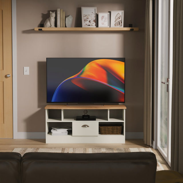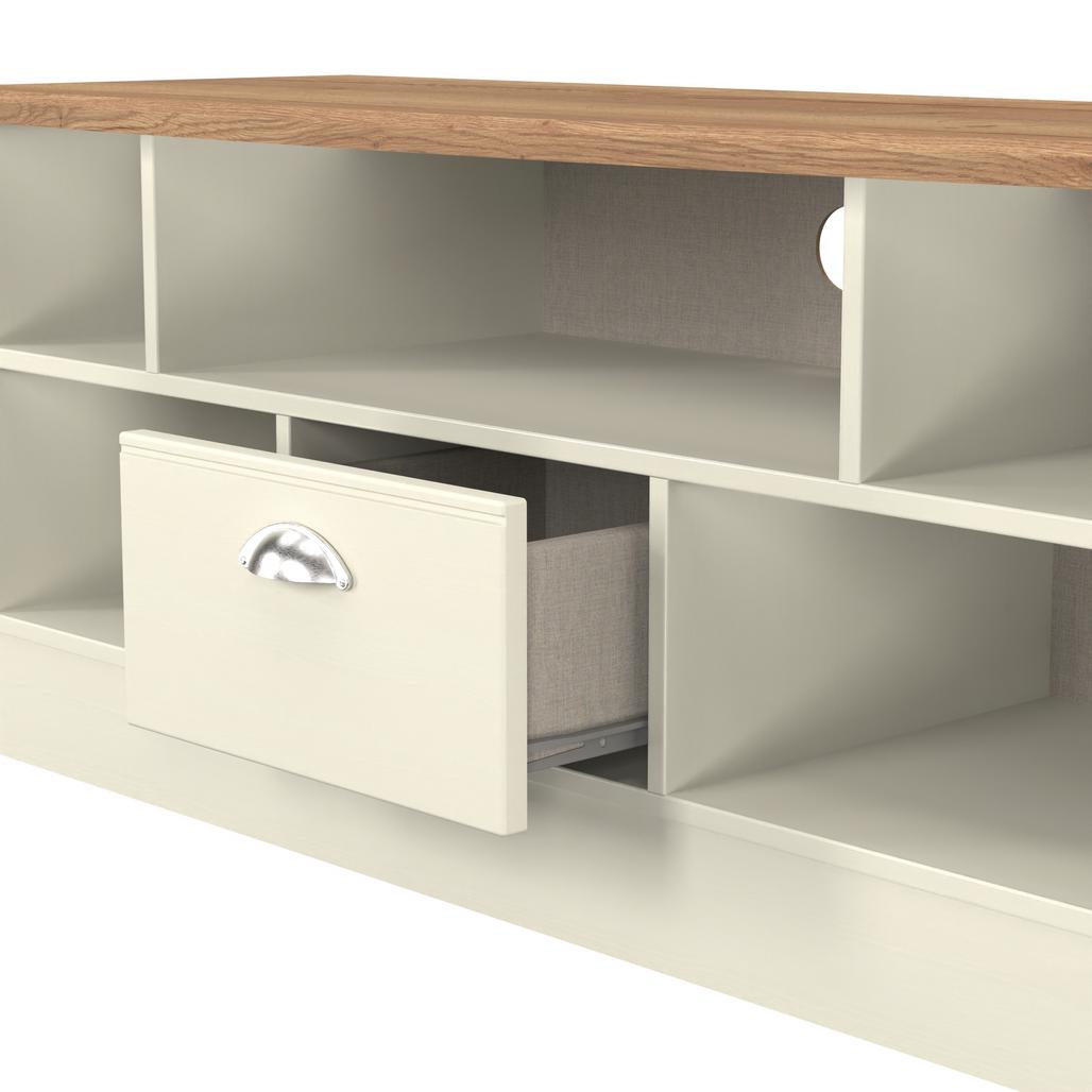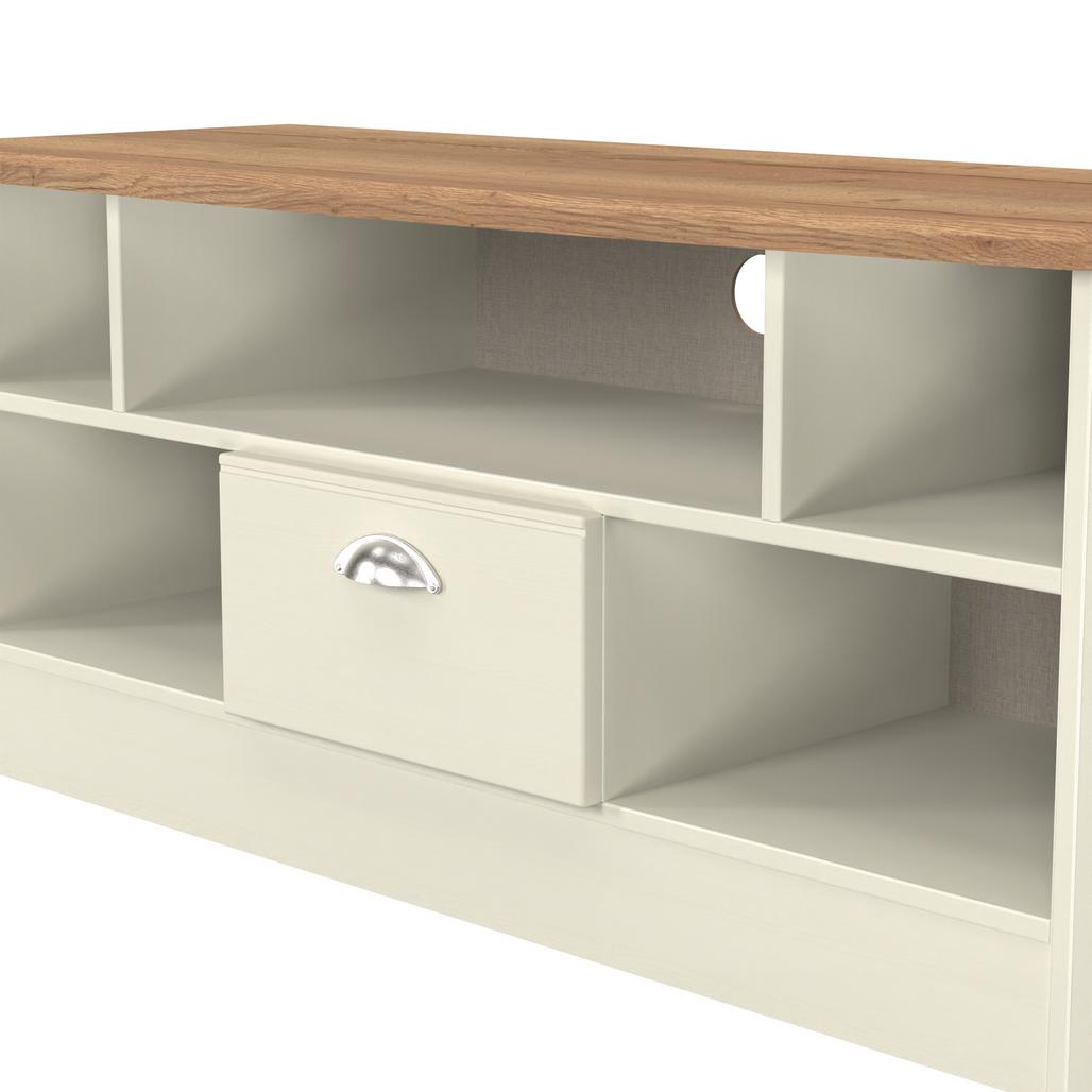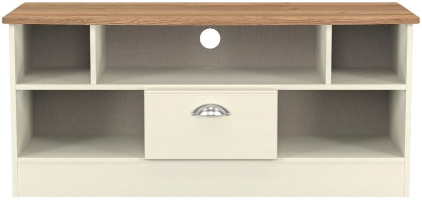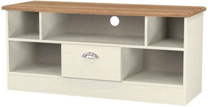 Victoria 1 Drawer Open Shelf TV Unit with Oak Top - Cream Ash is backordered and will ship as soon as it is back in stock.